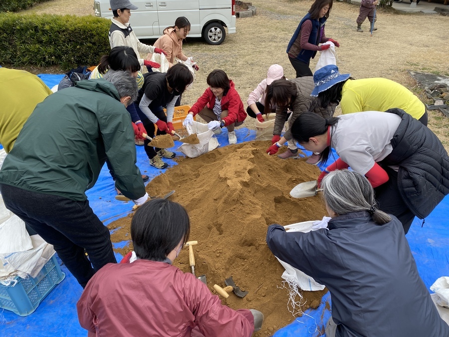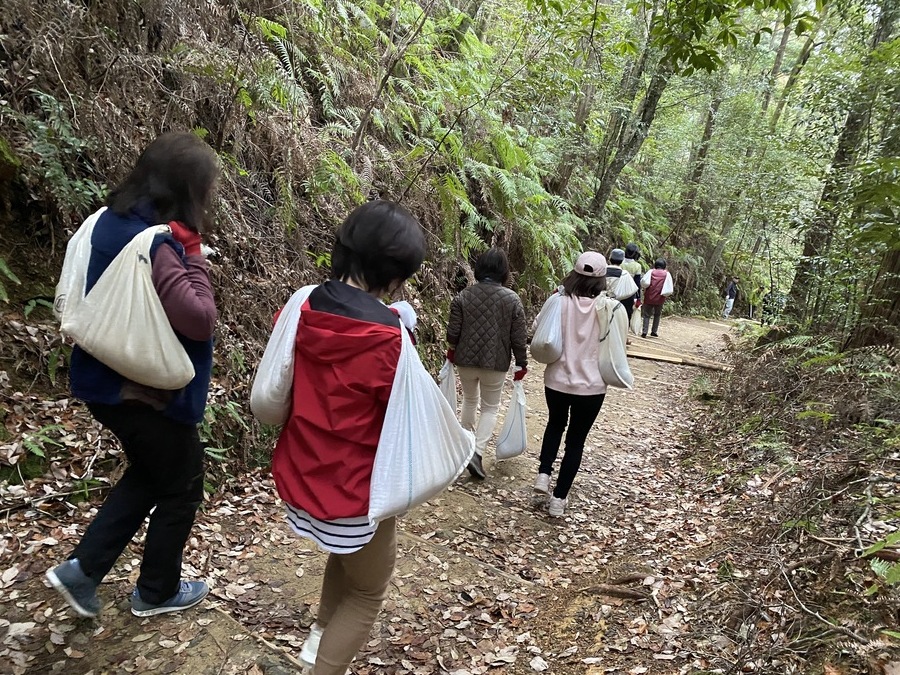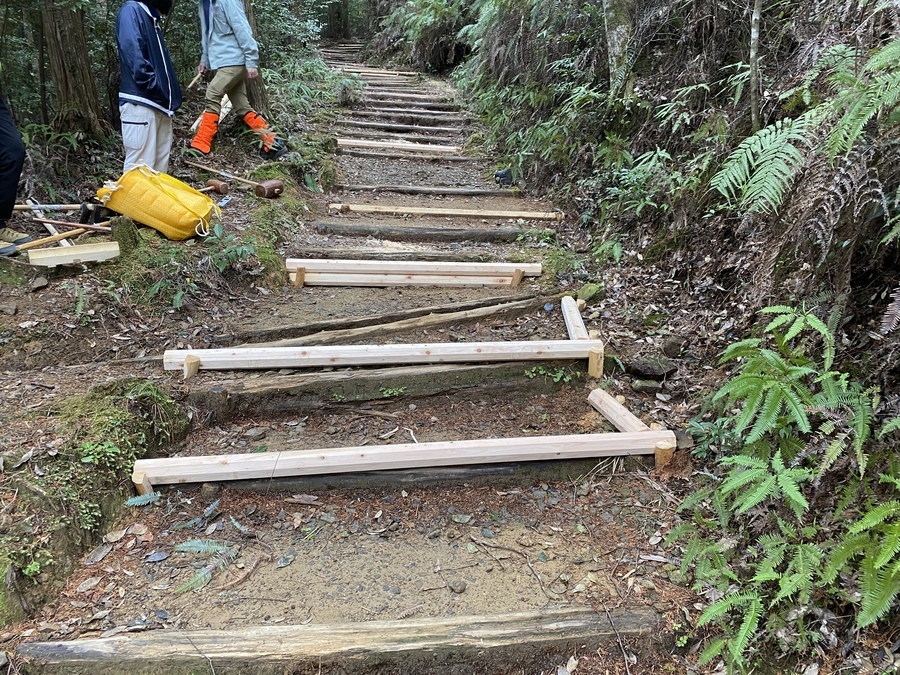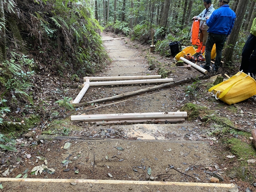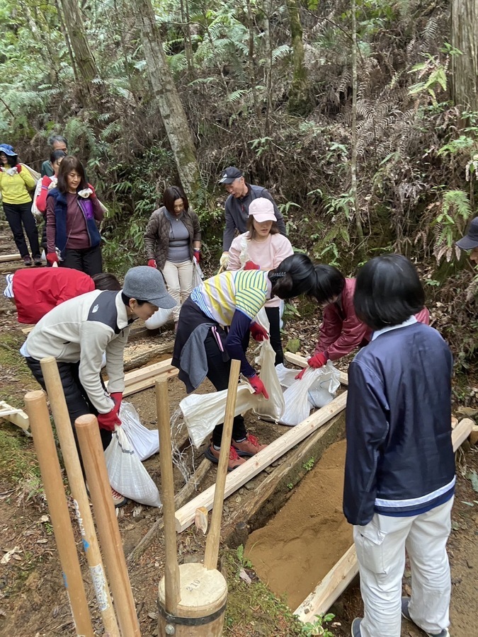 阪和興業株式会社様は、今回4回目の参加で18名の方々に道普請をしていただきました。東京、名古屋、大阪からここ熊野に足を運んでくださいました。天気も何とか持ち活動を始めることができました。今回は伏拝王子跡から70番道標に向けて約300mほど歩いたところで土の量は1tでした。明るく元気な方たちが多く終始楽しみながら活動されているのが印象的でした。多い方で土を7往復ほど運んでいただきました。土を固める道具である、たこやタンパーを使っての土固め作業も体験していただきました。いざ使ってみると力の入れ加減等が難しいみたいで苦戦している様子も見受けられました。最後には全員で足踏みをしたり、ジャンプをして土を固める姿はすごく一体感があり素敵だなと思いました。皆さんのおかげで5箇所の土入れができ道を保全することができました。作業終了と同時に雨が少しぱらついてきたので無事終えることができて良かったです。本日はありがとうございました。来年もお待ちしております。