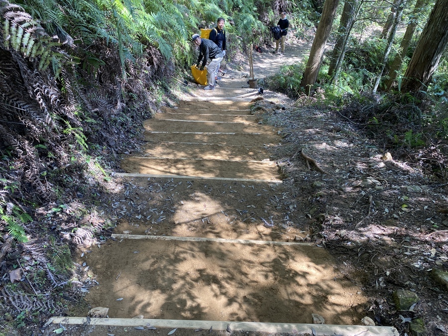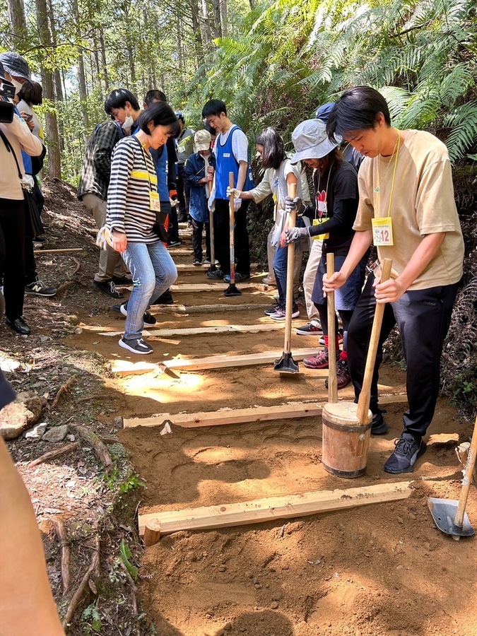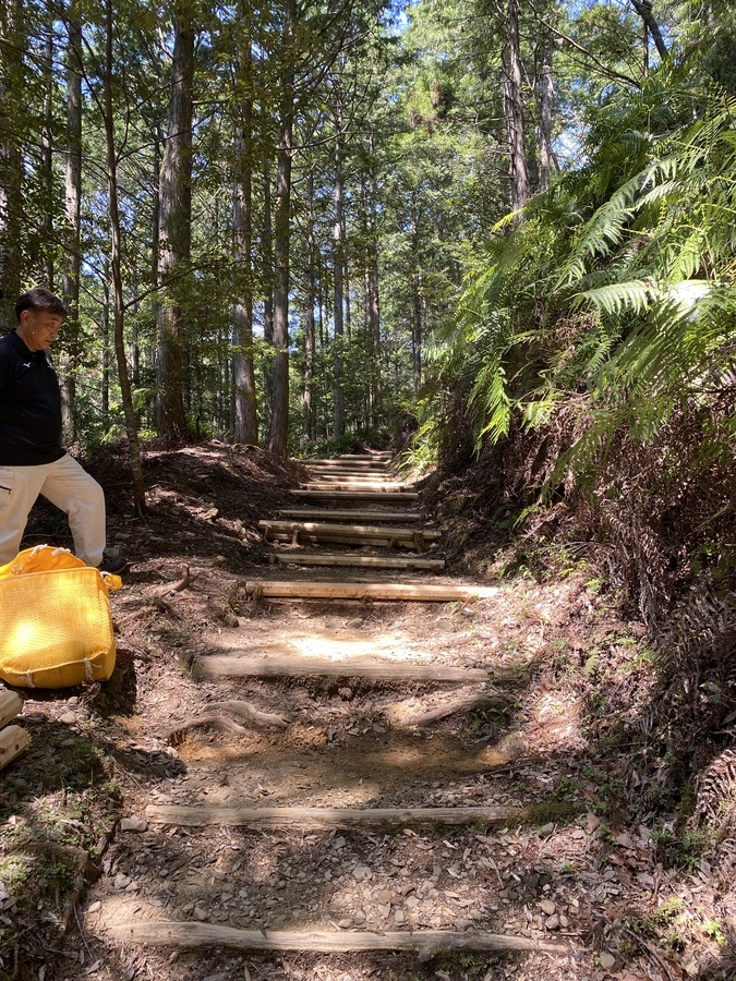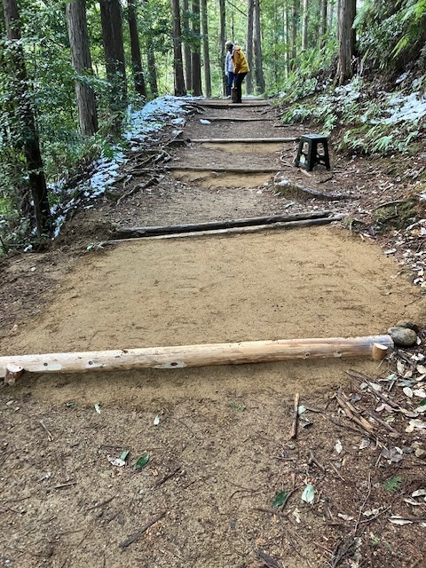 今日は、天気が良かったということもあり、たくさんの観光客の方々が古道を歩かれていて道普請箇所を通る度に「ありがとう」と感謝の言葉をかけていただきました。中には、外国人観光客の男性1人が土運びを手伝ってくれて参加者皆さんが笑顔になる一幕もあり、世界遺産を通して、素敵な交流ができました。最後に集合写真をグループごとに撮って解散しました。