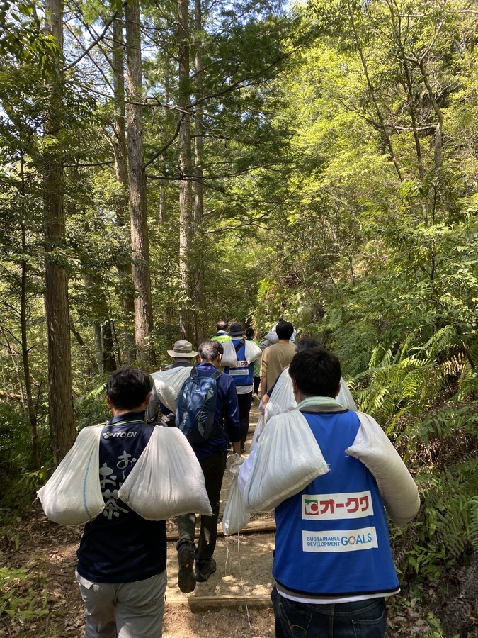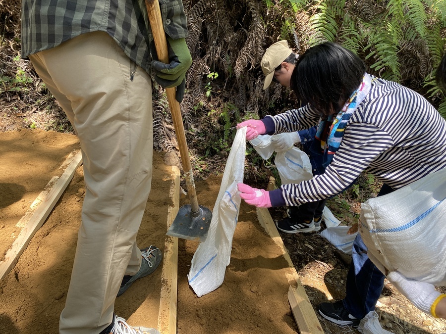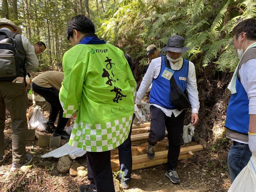 株式会社伊藤園と株式会社オークワ様が合同で道普請にご参加いただきました。伊藤園様は5回目の参加で、オークワ様は初めての参加となりました。48名の参加者の皆さんと一緒に活動をしました。初めに世界遺産熊野本宮館で出発式を行ってから活動場所に向かいました。今回の道普請箇所は、三軒茶屋跡から伏拝王子跡に向かって約300mのところでした。世界遺産センター職員から道普請活動についての説明後、作業に入りました。土を入れる担当の方が土嚢袋に適当な量の土を入れて、その土を運び終えるまで活動が続きました。1人あたり3〜4往復運んでいただきました。小学生〜ご年配の方まで幅広い年齢層の方々の参加で良い雰囲気での活動となり良かったです。土を固める作業もしていただき無事4箇所を完成させることができました。