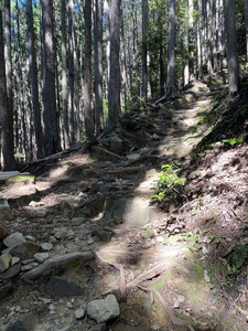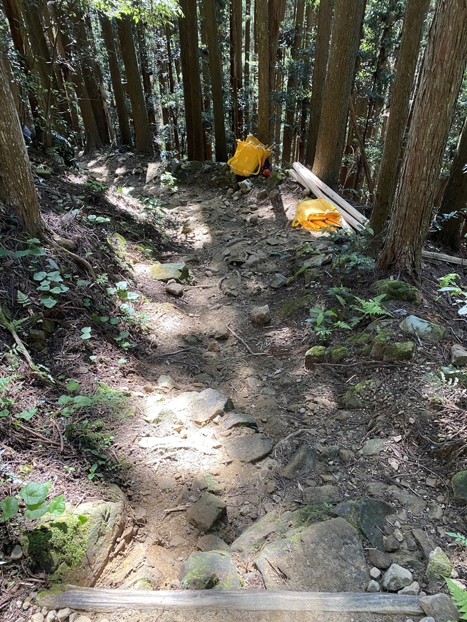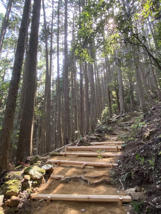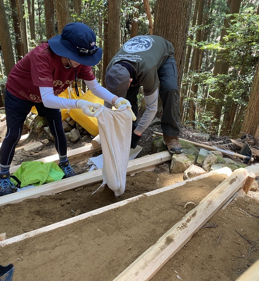 さわかみ財団様は今回で30回目の道普請の参加となり19名の皆さんと一緒に活動させていただきました。一月ぶりの再会でもあったので嬉しかったです。本日の天気は快晴で30度近くまで気温があがり夏のようでしたが、木立の中は涼しく活動のしやすい1日となりました。今回の道普請箇所は4月に行った大日越えの続きで前回の場所から50m登ったところで土置き場から約550m歩いたところでした。土の量は1.5tで1日作業をしていただきました。午前中は、土をひたすら土嚢袋に入れて、道普請箇所近くまで運ぶ作業を繰り返しました。いつも行う道普請よりも距離が遠いため、運ぶ箇所を決めておいてリレー方式を採用するなどの工夫がありました。午前中には4箇所の土入れができました。昼食後、土置き場に残っていた土を土嚢袋に入れるところから始まり、その後はチームプレイで道普請箇所まで土を運んでいただきました。1.5tの土を運ぶとなると約550mの区間を何往復もしなければならないので本当に大変だったと思います。無事運び終えることができ、9箇所の土入れを行うことができました。土固め作業もしていただき道を保全することができました。いつもほんとうにありがとうございます。活動終了後、道普請参加30回記念としまして感謝状を贈呈させていただきました。毎年4回もご参加いただき大変感謝しております。引き続きよろしくお願いいたします。