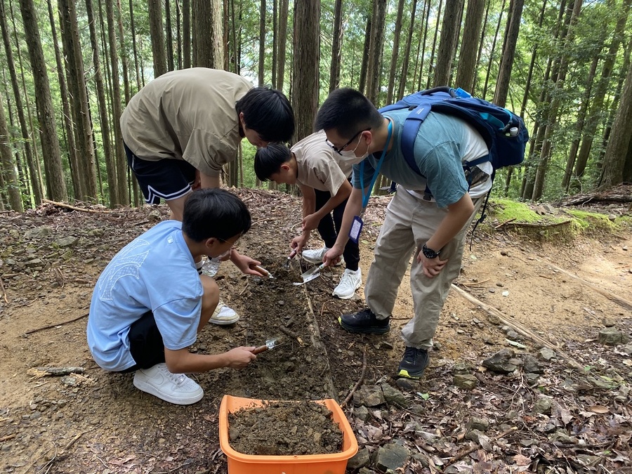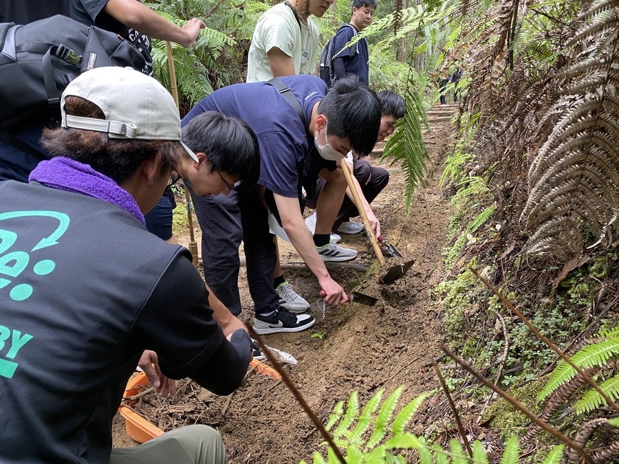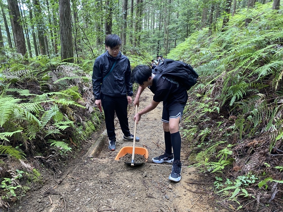 JKコーポレーション様は、今回が初めての道普請の参加で香港の男子高校生40名を連れてきていただき、一緒に活動を行いました。当初の予定では、土入れ作業をする予定でしたが、前日の天気が雨で当日も雨予報で古道が濡れていたため、側溝清掃作業を行うこととなりました。