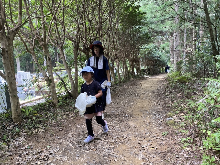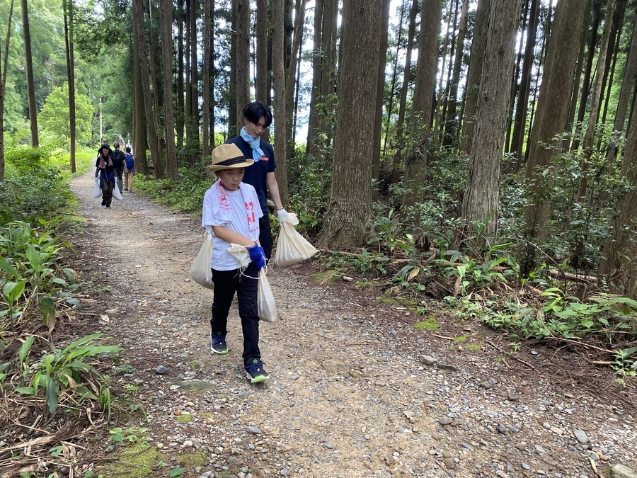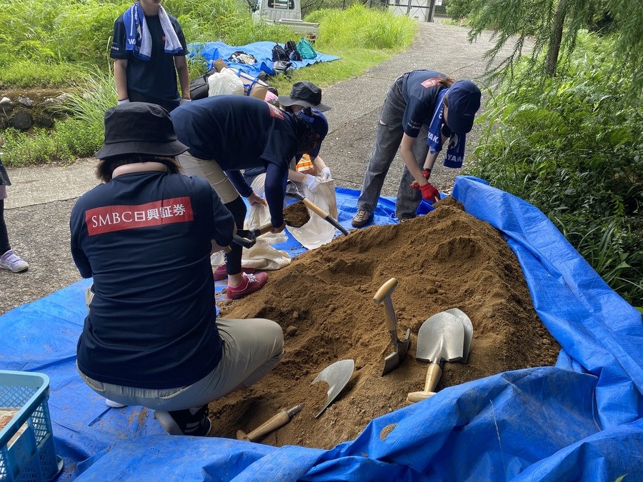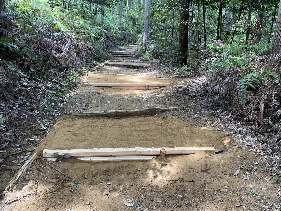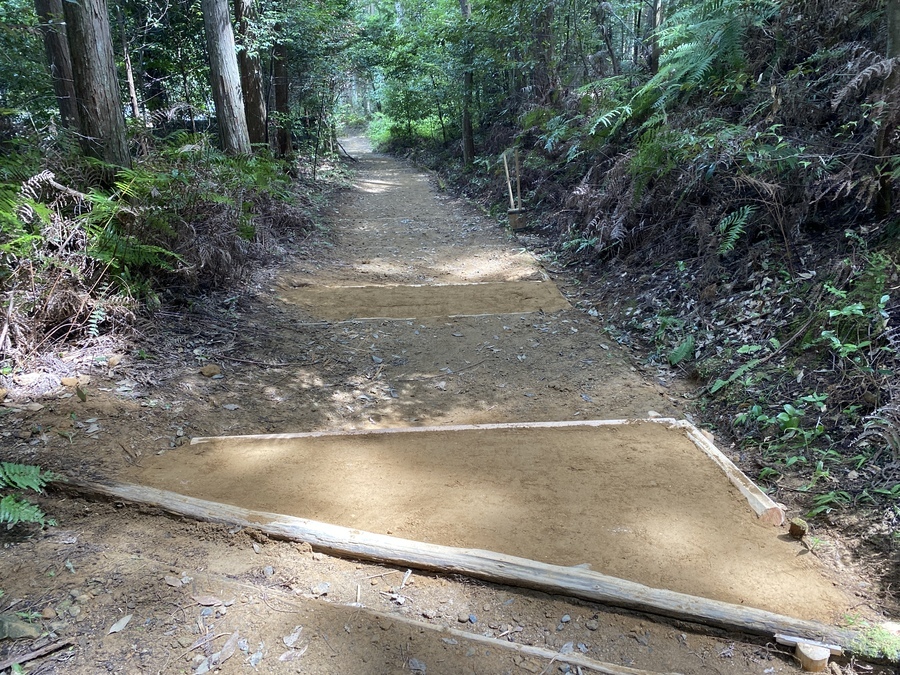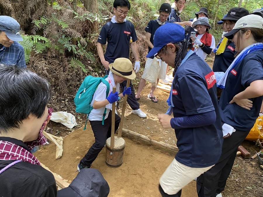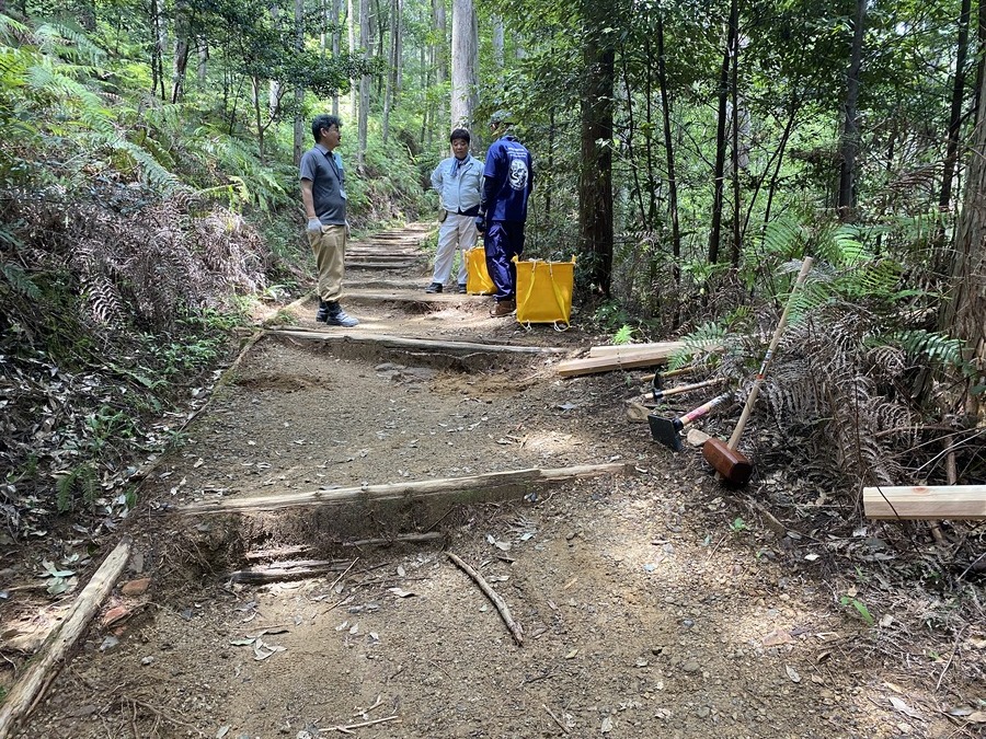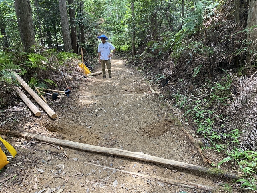 SMBC日興証券和歌山支店様は、今回が初めての参加で21名の皆さんと一緒に保全活動を行いました。和歌山市からお越しくださいました。お子様連れのご家族のご参加もあり嬉しかったです。初めに世界遺産熊野本宮館で世界遺産入門講座を受講していただき、「紀伊山地の霊場と参詣道」の登録資産や資産の価値について理解していただきました。その後、本宮大社や「ちょっと見晴らし展望台」を散策されてから道普請箇所にきていただきました。今回の作業箇所は、祓殿王子付近で土の量は1tでした。土置き場から約150m三軒茶屋跡方向に向かったところでの活動だったので1人あたり7〜8回往復していただきました。小学校1年生の女の子と小学校5年生の男の子も暑い中一生懸命運んでいただき、次世代を担う方々に道普請活動を知っていただけて良かったです。約1時間で土入れ作業と土固め作業ができ、最後に集合写真を撮って解散しました。ビフォーアフターの写真を比べて、驚かれている様子が印象的でした。暑い中での作業ではありましたが来年も一緒に活動ができると嬉しいです。本日はありがとうございました。