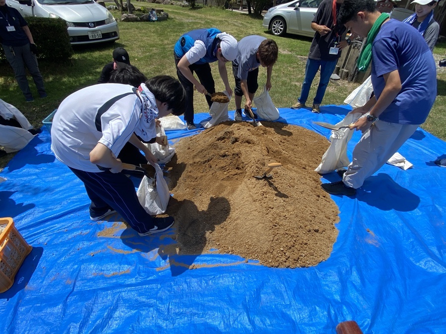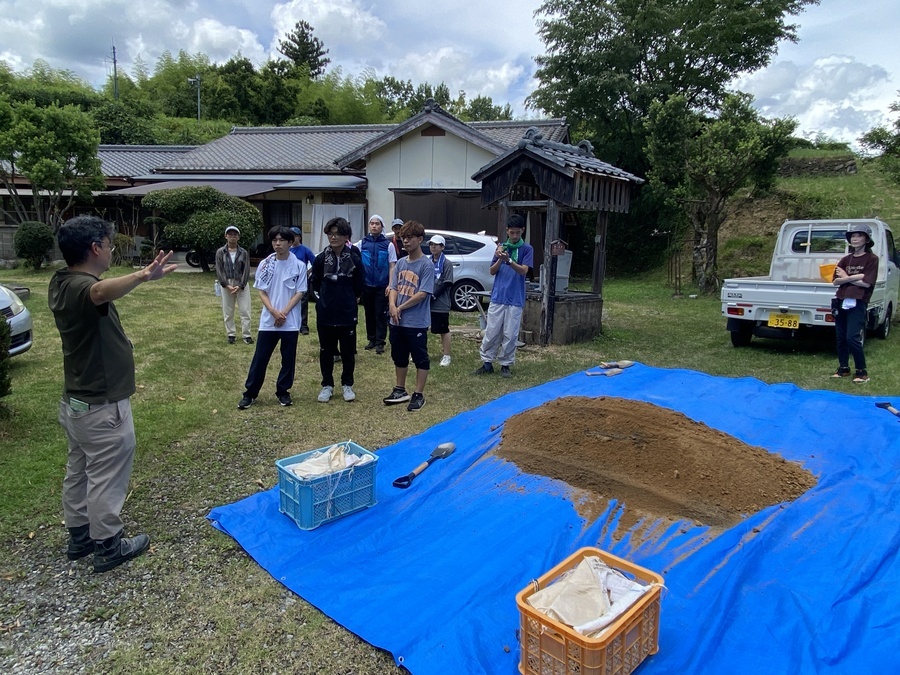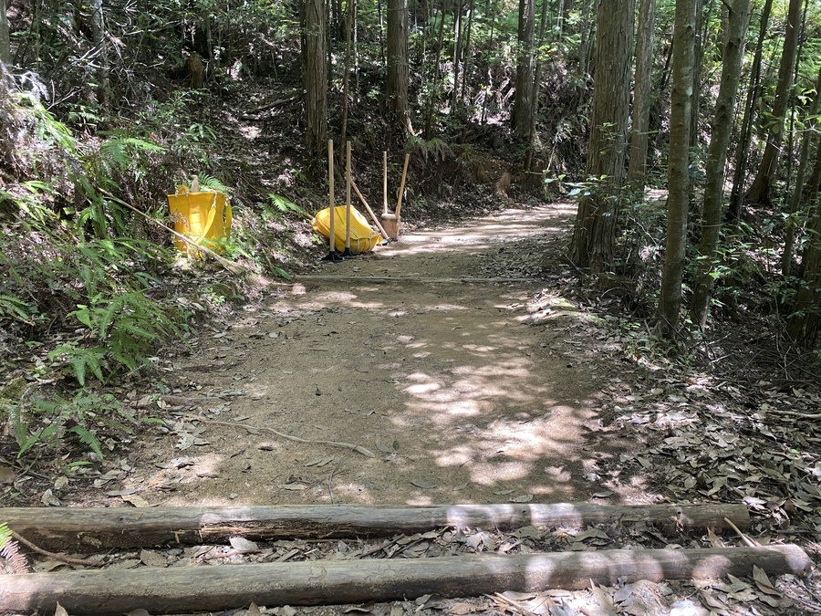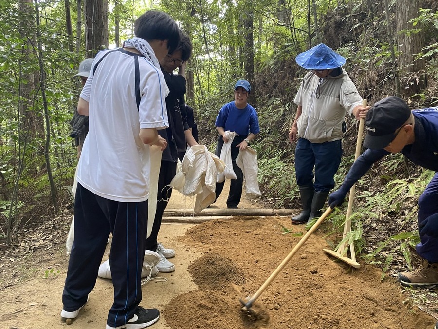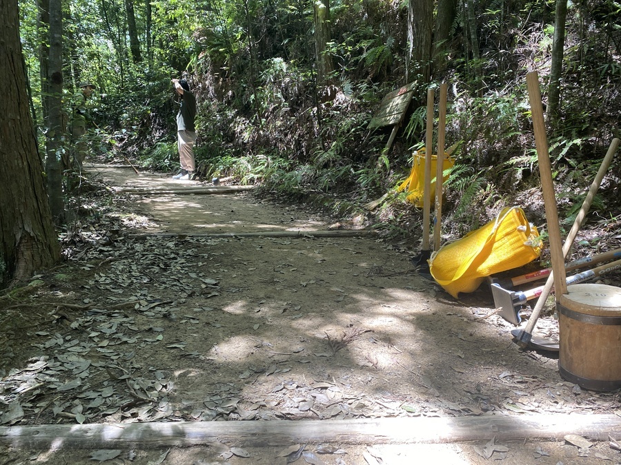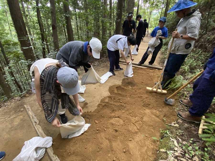 昼食後、語り部さんと合流し伏拝口バス停まで移動し、そこから道普請土置き場の伏拝王子跡まで歩いて来ていただきました。今回の土の量は0.5tで土置き場から約100mほど三軒茶屋跡に向かったところで1時間足らずで道普請を終了することができました。1箇所の土入れとなりましたが充実感のある活動内容だったと思います。土固め作業では、固めるコツを掴んでいる学生さんもいて楽しんでされていました。