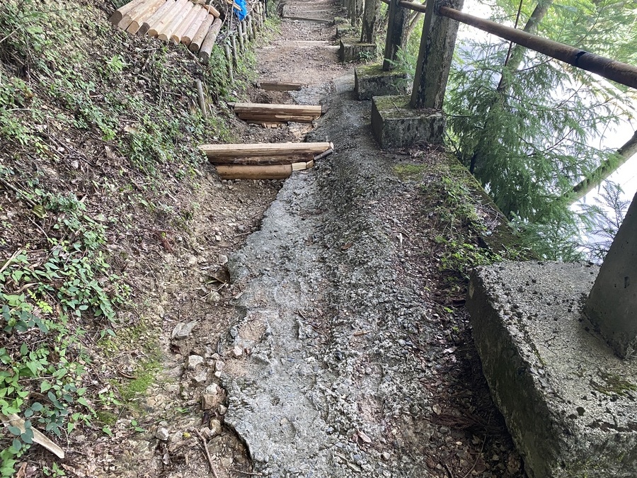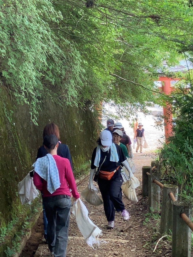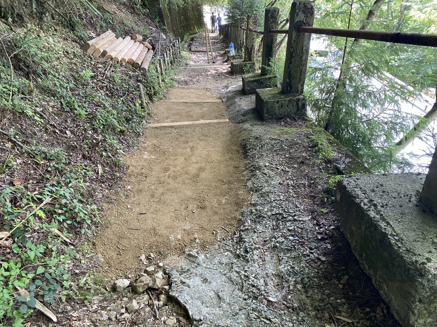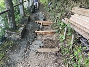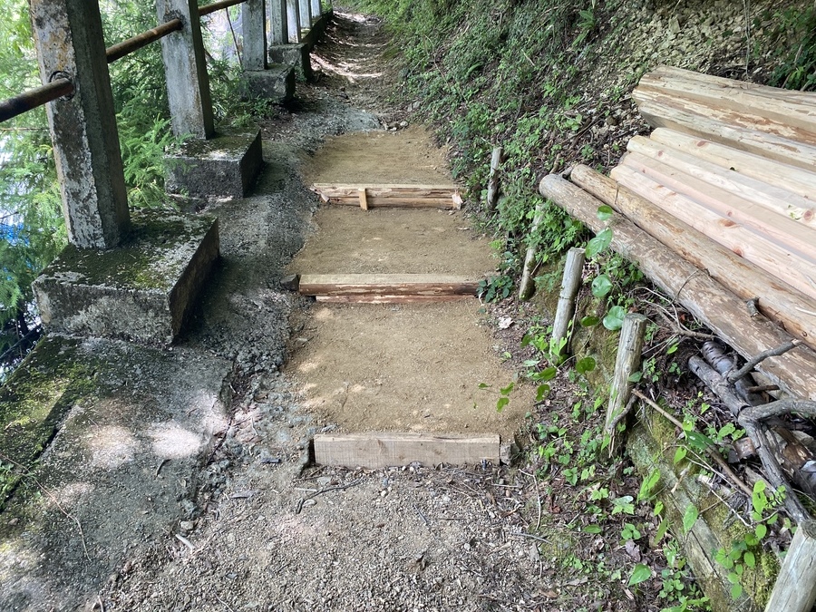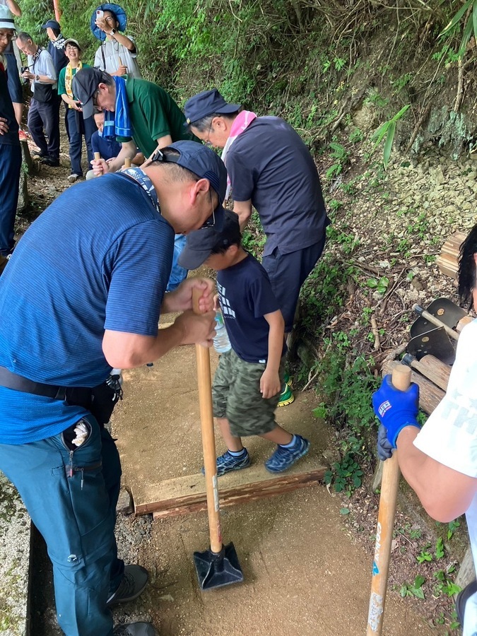 阪急交通社様は、今回で6回目の道普請の参加となりました。33名の皆様と一緒に活動させていただきました。大阪からバスで高野山までお越しいただきました。高野山内にも関わらず真夏日となり、暑い中での道普請となりました。今回の土の量は1tで活動場所は、大門から弁天岳に向かって約100mのところで行いました。一人当たり3〜4往復で約1時間で3箇所の土入れを終えることができました。コンクリートが剥き出しになっていたところだったので土を入れることができて良かったです。外国人観光客の方も多く歩かれているので古道の景観を少しでも感じ取ってもらえるように昔の道に戻していきたいです。遠いところ、そして暑い中ありがとうございました。また、来年もよろしくお願いいたします。
