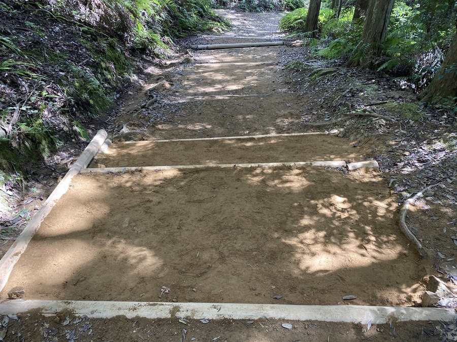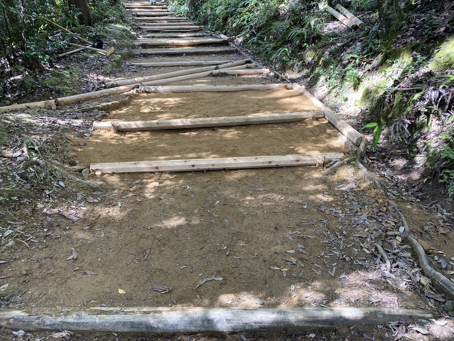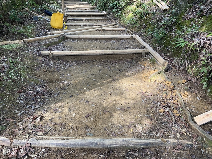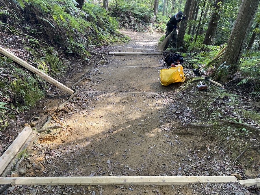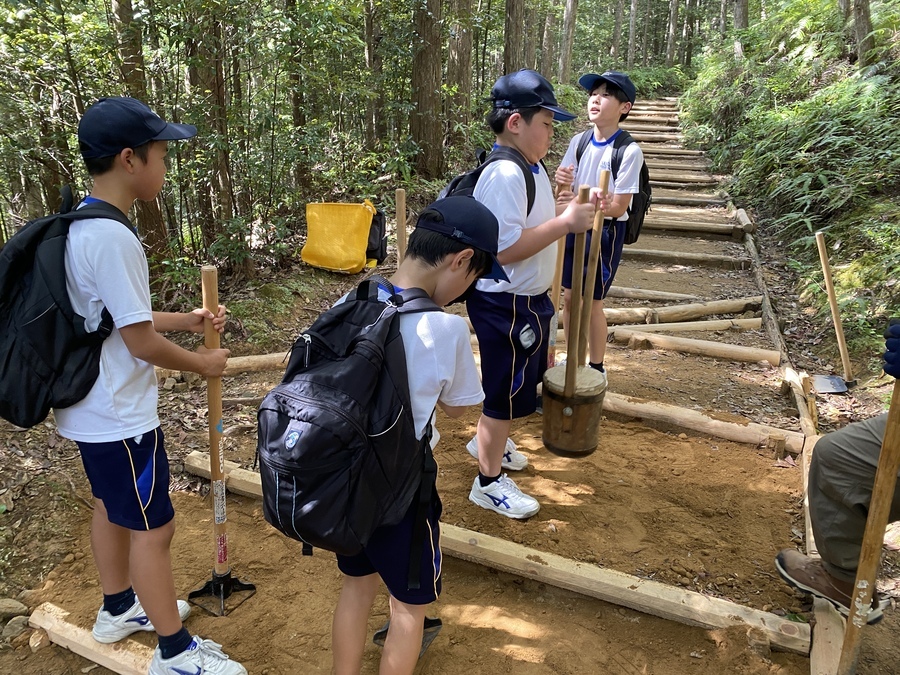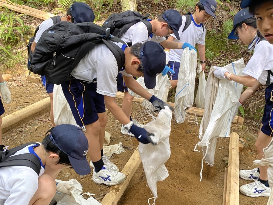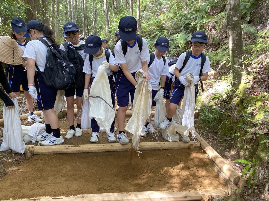 南山大学附属小学校様は、今回で8回目の道普請の参加となりました。6年生96名の皆さんと一緒に活動させていただきました。場所は、伏拝王子跡から三軒茶屋に向かって約500m進んだところでした。6つの班に分かれて、語り部さんと一緒に道普請をしていただきました。今回は人数と時間の関係もあり、ワンウェイ方式での活動となりました。土を土嚢袋に入れて、道普請箇所まで運び、土を固める一通りの流れをやっていただきました。土を入れる場所も狭く、活動しにくいところでしたが声を掛け合いながらする姿には感心しました。たこやタンパーといわれる昔の道具も皆さんに体験していただけたので良かったです。活動終了後、熊野本宮大社を目指して歩かれました。