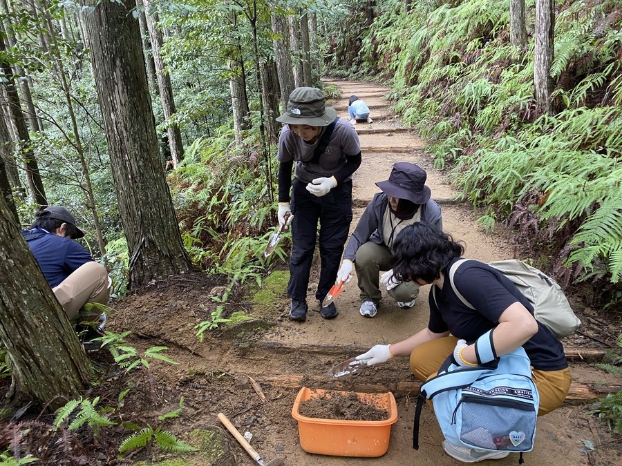 前日の雨の影響と、当日の雨予報も重なり今回は側溝・横断溝の清掃作業となりました。初めに本宮行政局で開会式をし、昼食を食べてからバスで伏拝口バス停に移動して、そこから伏拝王子跡付近でセンター職員と合流し、4つの班に分かれて作業がスタートしました。子供連れの方も多く賑やかな雰囲気での活動となりました。作業箇所は、伏拝王子跡付近から三軒茶屋跡までの約1kmの区間でした。雨の影響で土が溝に流れてしまうと、古道にも水が入り込んでしまい土が流れてしまうという悪循環になってしまうので溝の土や落ち葉、木などをどけていただきました。私の担当したグループでは子供たちが3名いましたが土をかく道具を使って一生懸命、溝を掘ってくれたのが嬉しかったです。約1時間の活動で古道が守られたと思います。足元が悪い中ではございましたがご協力いただきありがとうございました。来年も引き続きよろしくお願いいたします。
