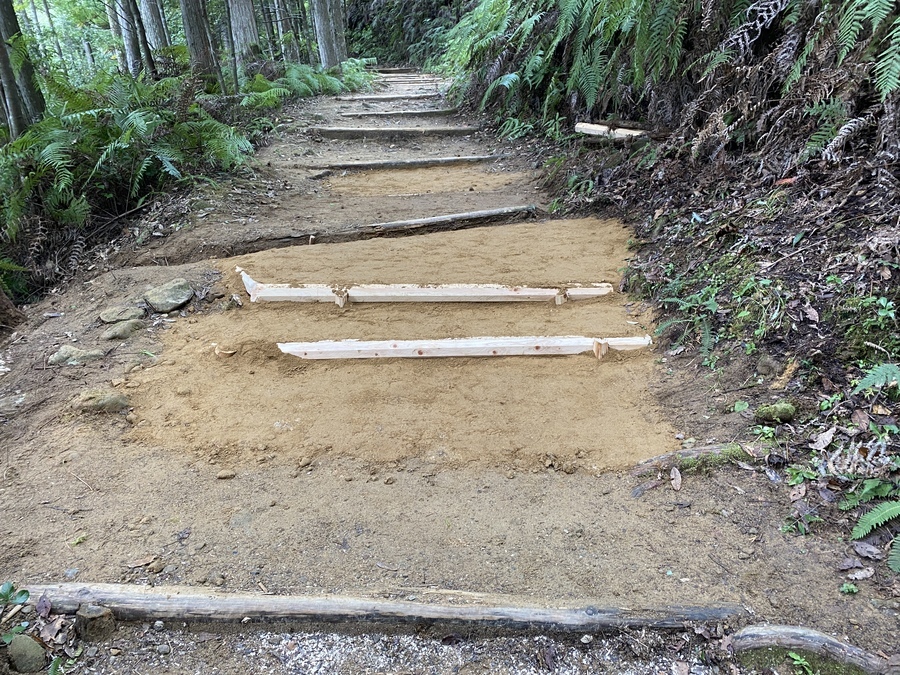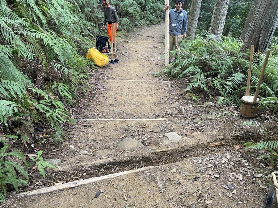 初めに平岩口バス停で待ち合わせをし、一緒に三軒茶屋跡まで歩いて行きました。参加者どうしの中でも話したことがない方もおられるとお聞きしてびっくりしました。三軒茶屋跡に到着してからセンター職員が道普請活動の説明を行いました。その後作業がスタートしました。今回の道普請箇所は三軒茶屋跡から伏拝王子に向かって約150mのところで土の量は0.5tでした。みんなコツコツ作業をしていただき30分くらいで活動を終えることができました。土運びは一人当たり3〜5往復で土固め作業もしっかりやってくれました。みんなの足で踏み固めたり、土を固める道具を使うなど一通りの道普請活動をしていただくことができました。道具の片付け等も手伝っていただき感謝しております。