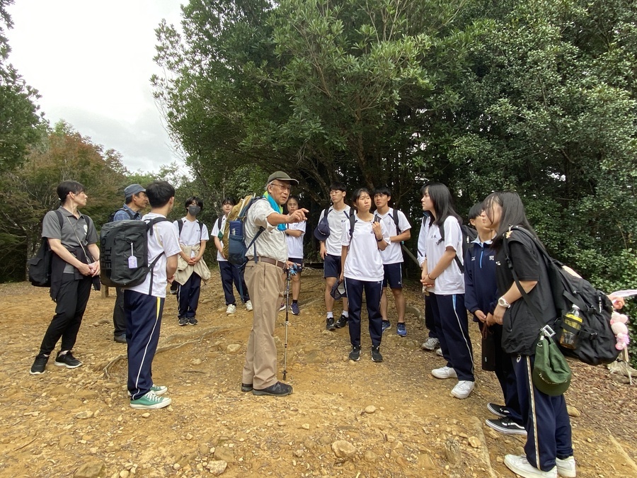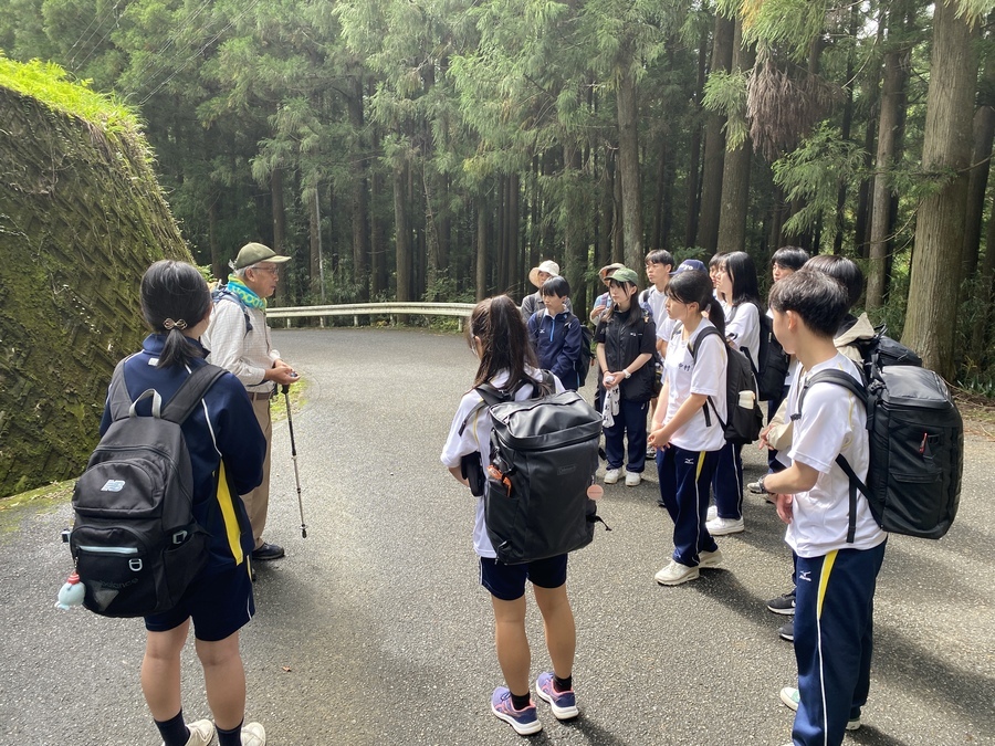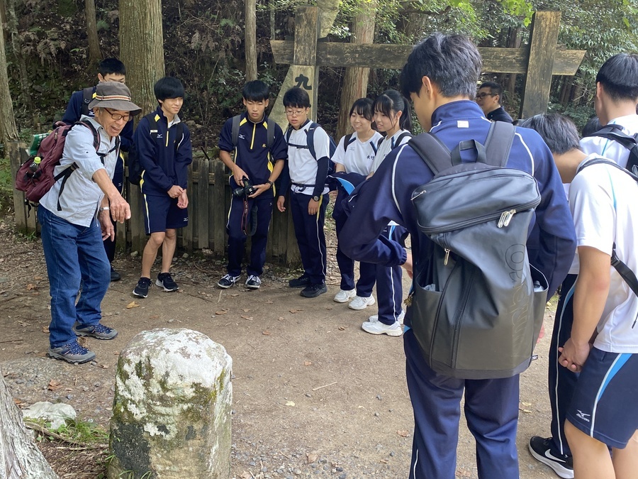 その後、世界遺産マスターと合流し、2班に分かれて現地学習を行いました。三軒茶屋跡〜本宮大社の区間でした。マスターの話をしっかり聞きながら学びを深めていました。大峯奥駈道の修験者が修行をする際の掛け声をみんなでしたりと楽しい時間を過ごすことができました。見晴らし展望台で大斎原を見たときに、感激している姿を見ることができて良かったです。最後に、熊野本宮大社でお詣りをして解散式をしました。
