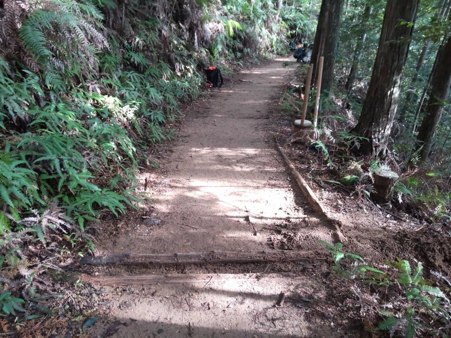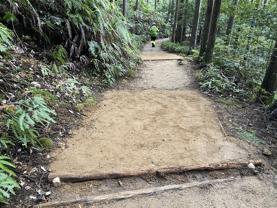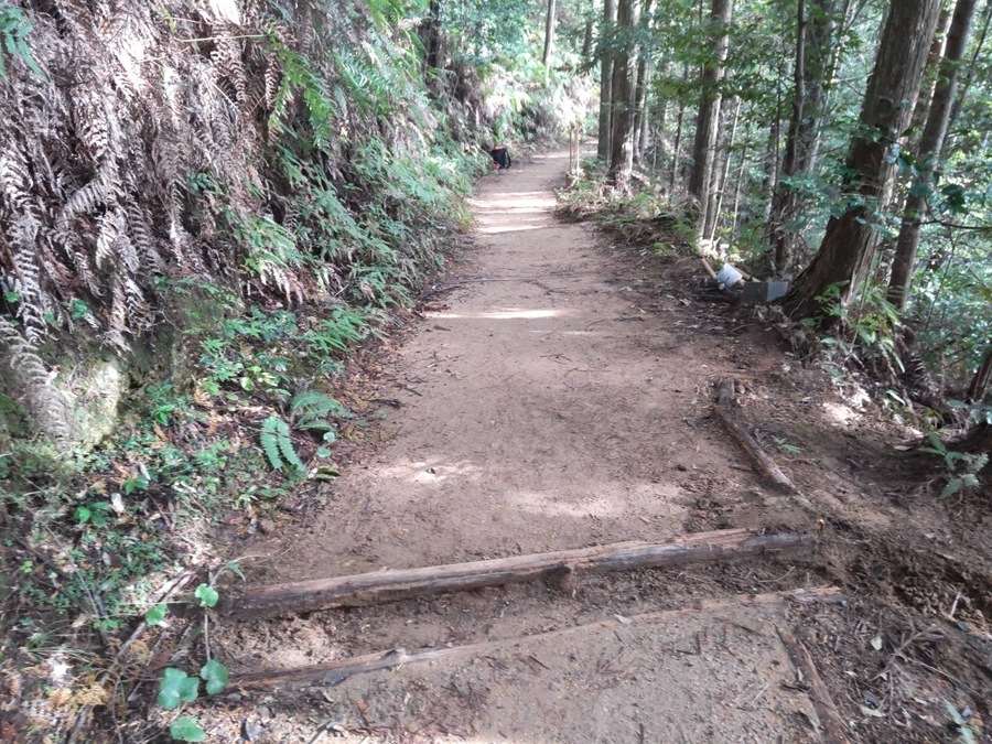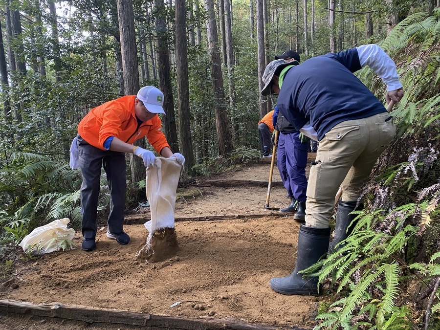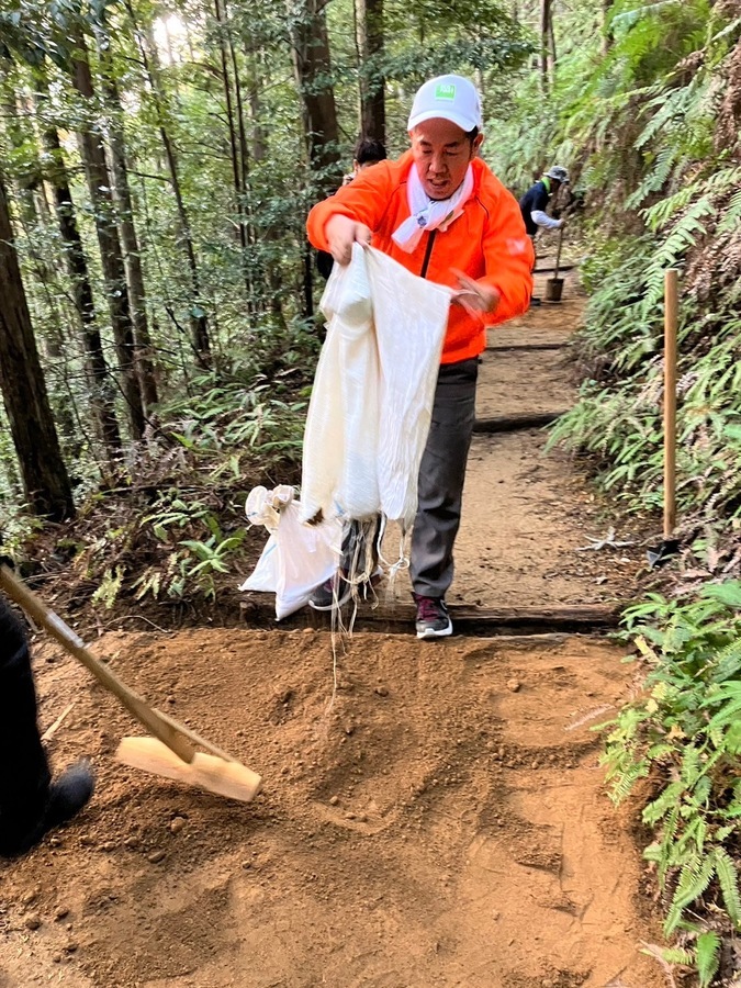 その後、道普請のためにバスで伏拝口バス停まで移動し、そこから伏拝王子跡まで歩いて向かいました。到着後、世界遺産センター職員が道普請の説明をしてから作業がスタートしました。土の量が1.5tで場所は伏拝王子跡から三軒茶屋跡に向かって約250mのところでした。土を入れる担当と、土を運ぶ担当に分かれての作業でテンポ良く進んでいきました。1人で4袋を一気に運ぶ方が多くさすがだと思いました。少しずつ疲れも押し寄せて握力がなくなっている方も多かったです。1人で5〜6往復を運んでいただきました。土運び作業を終えると次は土を固める道具を勢いよく使っていただき固めることができました。その後、「しょいこ」のご寄付をしていただきました。いつも道普請活動の際に必要な道具をご寄付いただき本当にありがとうございます。