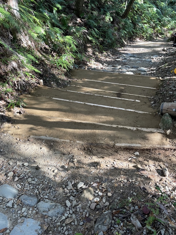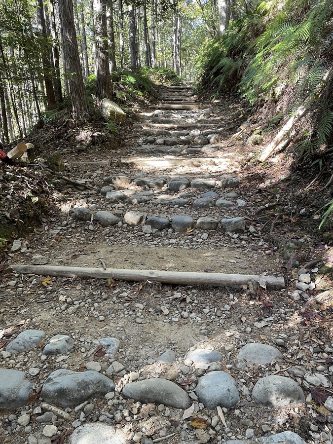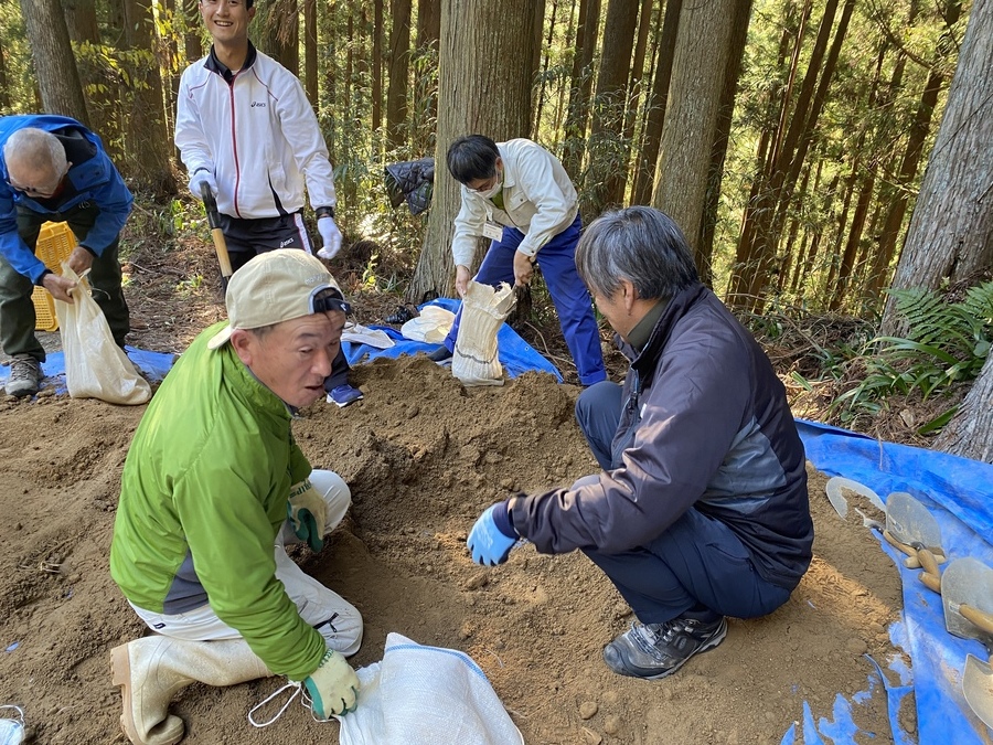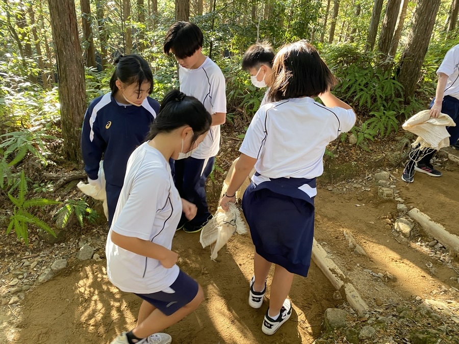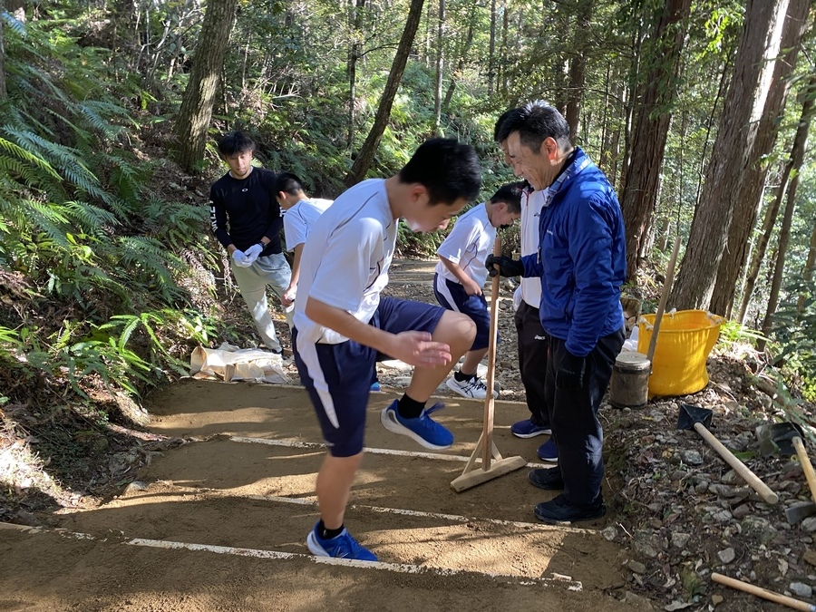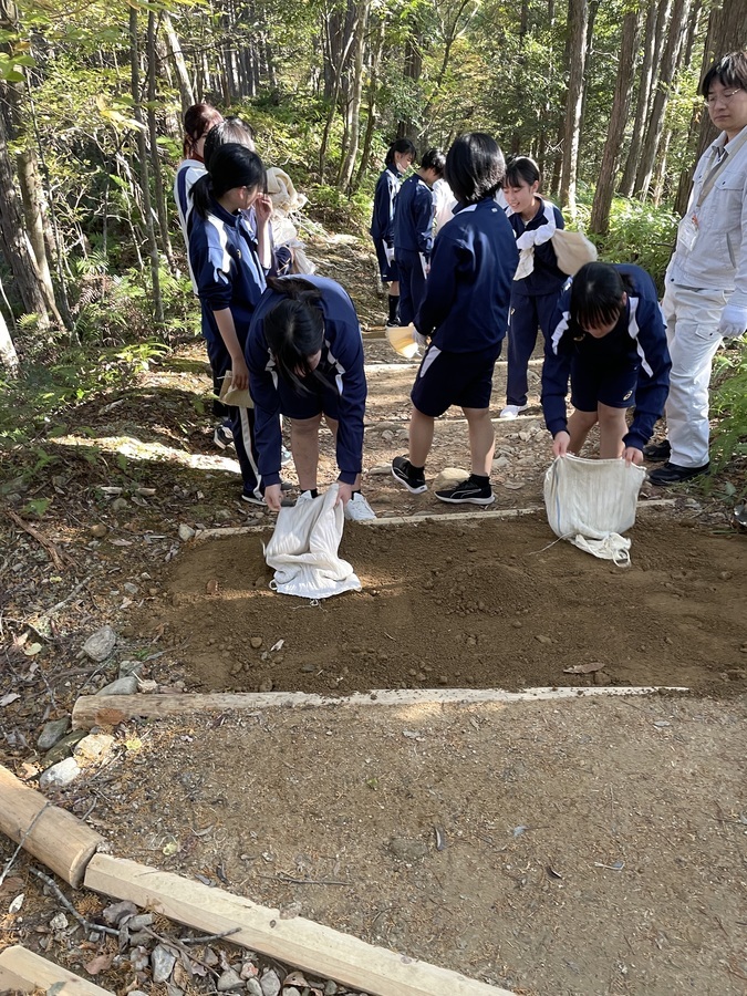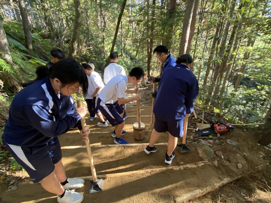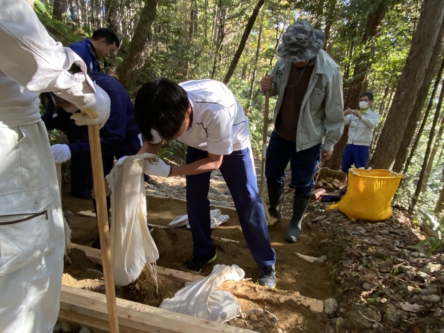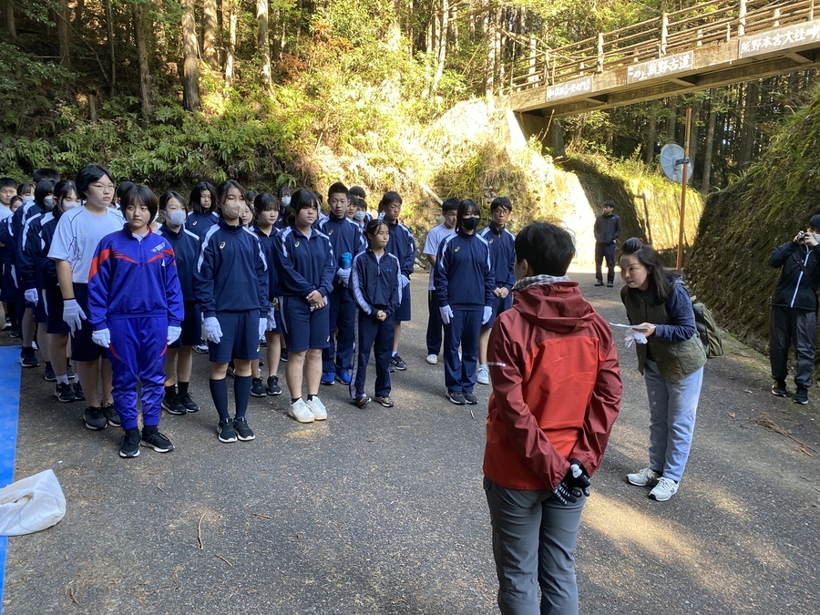 田辺市立本宮中学校様は、今回で13回目の道普請の参加となりました。生徒、教師、本宮教育事務所、熊野本宮語り部の会総勢54名での活動となりました。始めに中学校に伺い、道普請の概要や作業説明等を約15分間で話させていただきました。世界遺産クイズでは和やかな雰囲気になり良かったと思います。活動に関しても改めて聞いていただくことで作業に意義を感じていただけたのなら嬉しいです。説明後、バスで道普請作業箇所である三軒茶屋跡に移動しました。そこで熊野本宮語り部の会の松本様から挨拶をいただきその後、作業を開始しました。今回は三軒茶屋跡から伏拝王子跡に向かって約400mのところでした。土の量が2tだったのでハードだったと思います。しかし、中学生はタフで多い方で8往復、その他の方で5〜6往復していただきました。語り部の会、教育事務所、教師の皆様にも多大なる協力をいただき地域が一つになり活動できるこの機会はとても有意義なものであると感じました。土を踏み固める作業は楽しみながらされていたので良かったです。生徒同士で盛り上げていたり、先生とコミュニケーションを取りながら良い雰囲気で活動されていました。時間通り約1時間で作業を終え解散しました。