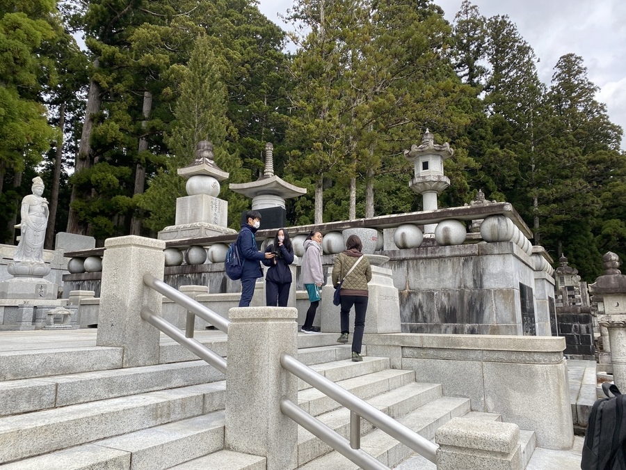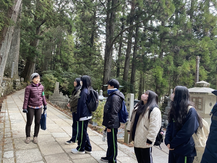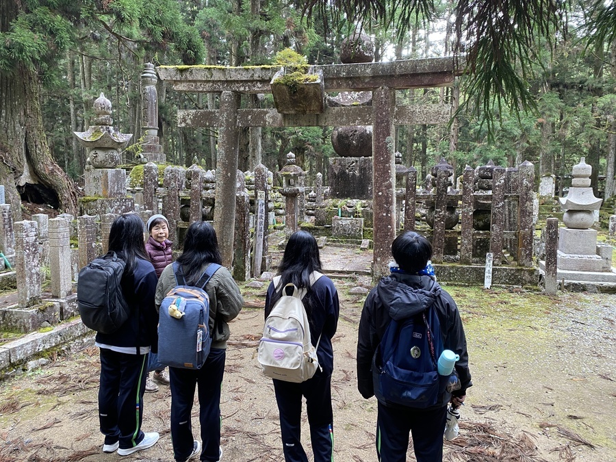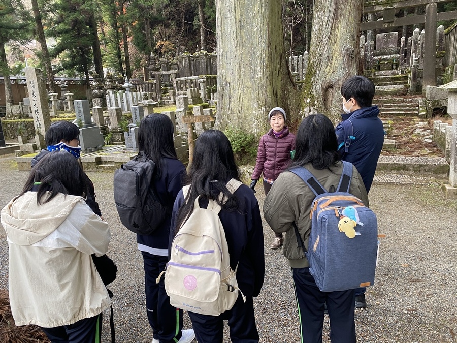 迎えた当日、高野山で現地学習を行いました。今回のコースは、「一の橋〜弘法大師御廟」でした。世界遺産マスター2名と一の橋バス停前で合流し紹介をしてから現地学習がスタートしました。2時間半と時間がたくさんあったので約4kmにある道中で様々なスポットを丁寧に説明していただきました。戦国武将の供養塔が立ち並ぶエリアでは、歴史の授業で勉強していた方が名前があり、興奮していました。奥の院墓石碑の中で最も大きい「一番石」で知られている崇源夫人五輪塔の説明では大きな石をどのように運んできたのかをマスターから聞き、昔の人の知恵に驚いていました。弘法大師御廟は現在、改修工事がされていたので中には入れませんでしたが荘厳な雰囲気を味わうことができました。その後、企業のお墓が立ち並ぶエリアにいくとヤクルトやUCC珈琲などの知っている企業の慰霊碑がありました。