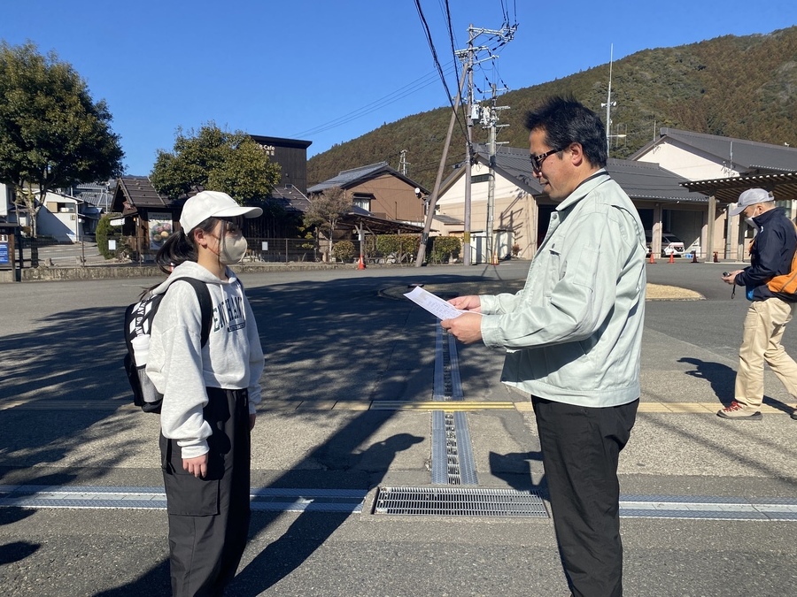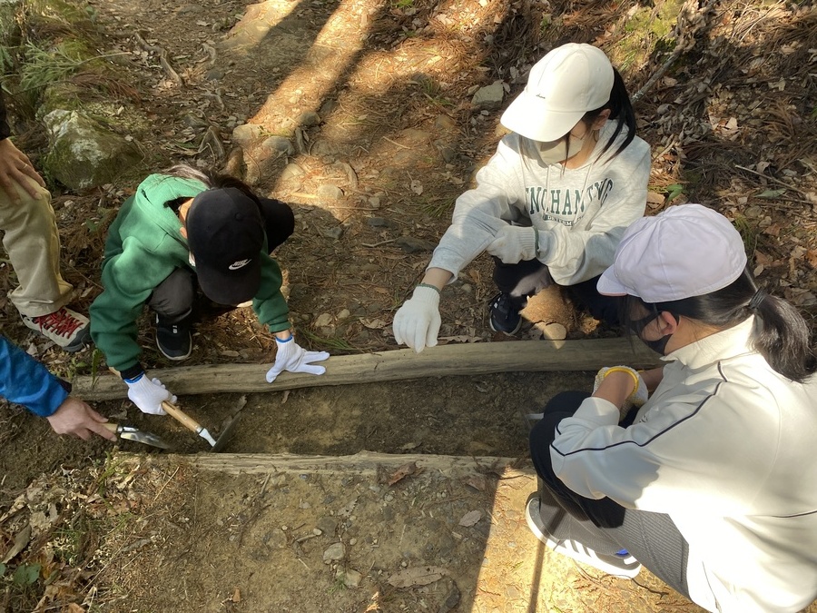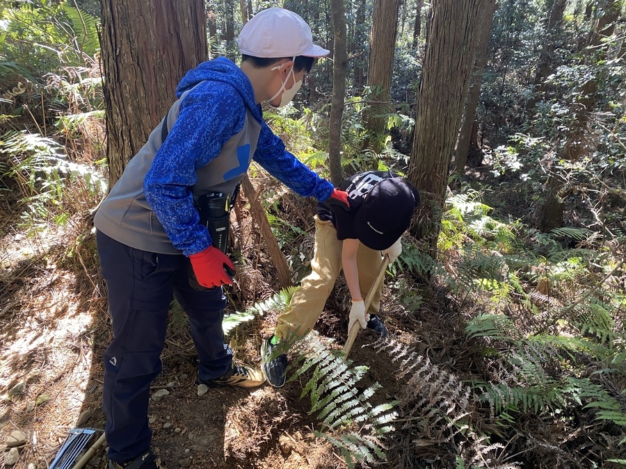 その後、バスで発心門王子まで向かい古道歩きをスタートしました。熊野本宮大社までの約7kmを歩きました。各王子社ごとの見所を世界遺産センター職員が説明しました。一生懸命聞いている姿が印象的でした。それから伏拝王子茶屋跡で昼食を食べてから三軒茶屋跡に向かい、その地点から祓殿王子付近まで清掃作業を行いました。内容としては、側溝に詰まっている土を取り除いたり、道に落ちている枯れ木や枯れ葉、石などを取り除いたりしました。作業をしている時は時間があっと言う間に経った気がします。これで雨が降った時にも水がちゃんと流れて古道が削れなくなると思います。作業が終わってからは本宮大社でお参りをし、最後に道普請(清掃作業)の参加が5回目だったので感謝状を贈呈させていただきました。これからも地元にある世界遺産の保全にご協力いただければ嬉しいです。1日お疲れ様でした。
