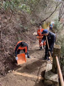 今年も高野山大門付近で実施いたしました。天気が不安定な状況だったので土嚢袋に入れた土を運ぶ作業ではなく、現地の土を「鋤簾(じょれん)」で「てみ」に集めて、作業箇所まで運ぶ作業となりました。13時頃に大門に集合し、世界遺産センター職員から道普請活動の説明を行ってから作業をスタートしました。普段から鉄道の線路敷きの整備をされているプロ集団なので一連の作業がスムーズで一体感もあり、予定されていた終了時間よりも早く作業を終えることができました。