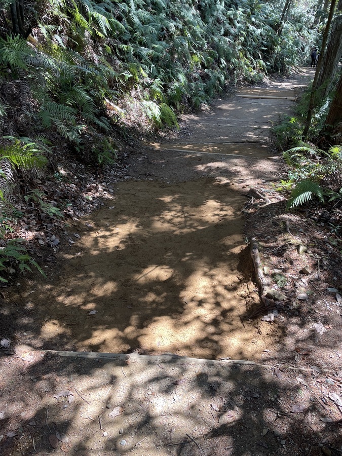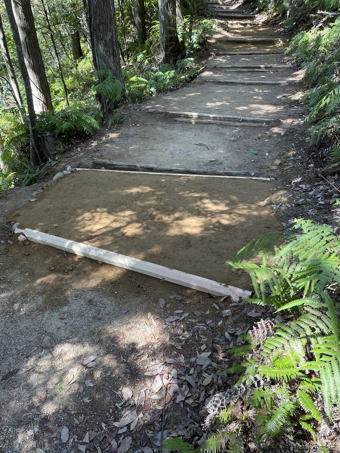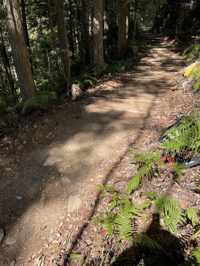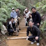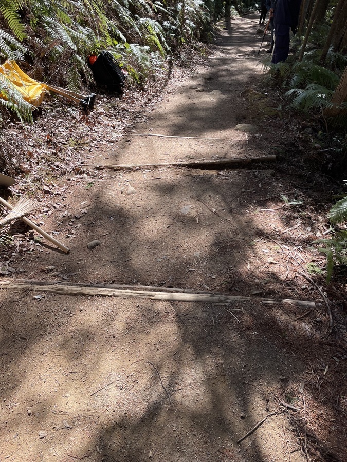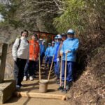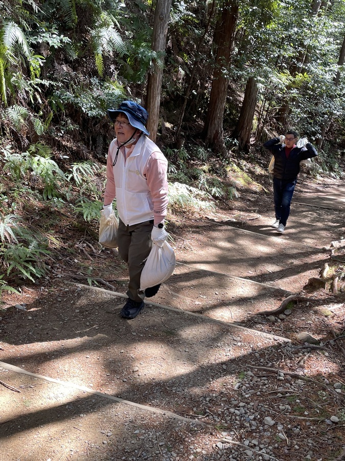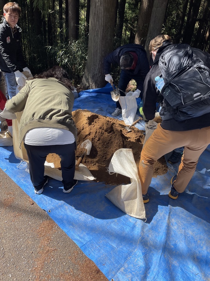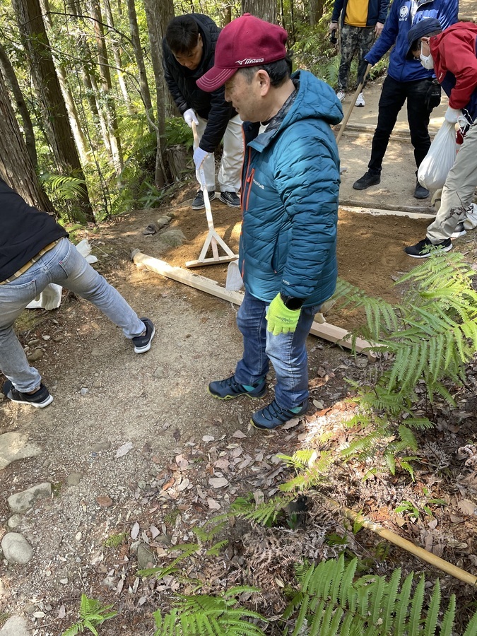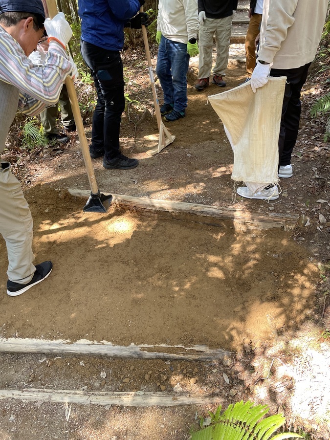 世界遺産センター職員と一緒に伏拝口バス停から歩かれ、古道歩きを楽しまれていました。その道中にある三軒茶屋跡に土置き場を作りました。初めに世界遺産センター職員から活動の説明をし、作業をスタートしました。職員と知り合いの方もいたので話をしながらよい雰囲気での活動となりました。土入れ作業も土固め作業も体験していただき、およそ1時間で終了し、その後昼食を食べ、熊野本宮大社まで歩かれました。少し温かい季節にもなってきたので古道歩きにはぴったりだったのではないでしょうか。