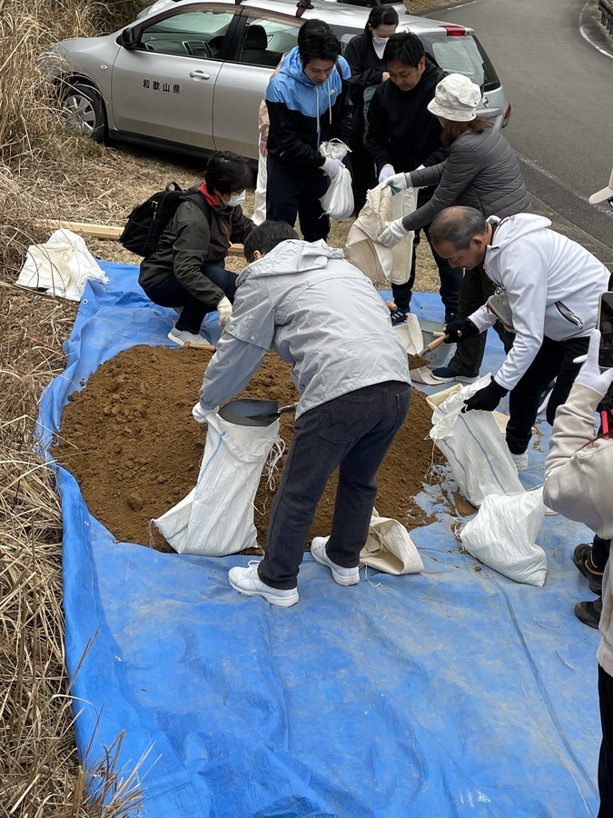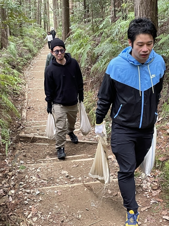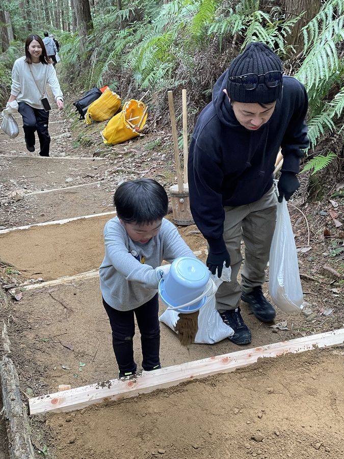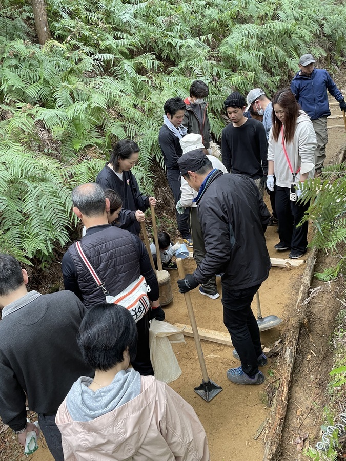 先に世界遺産入門を受講していただいた後、伏拝口バス停まで乗り合わせで来ていただき、歩いて100mくらいの土置き場で世界遺産センター職員の説明を受けていただき、0.5tの土を運びました。水呑王子方面へ3~400mの上り坂を土を一人2袋くらい持ち、土入れ、土固めの作業をしていただきました。