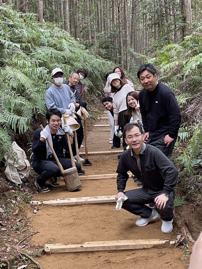 Jライフ様は、別の団体で道普請を体験された方もいらっしゃいましたが、この団体としては初めての参加で、14名の方が来ていただきました。この日は昼から雨の天気予報が出ており、土入れができるかどうか心配していましたが、無事開催することができました。