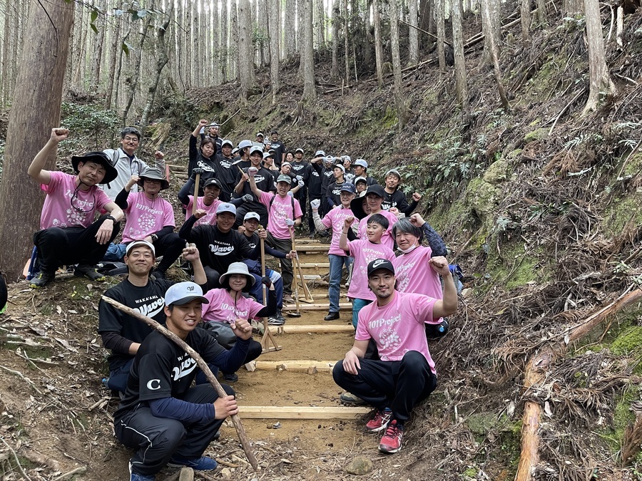 さわかみ財団の道普請は今回で33回目となりました。今回は、さわかみ関西独立リーグのスポンサーをされているさわかみ財団とリーグに所属している和歌山ウェイブスがタッグを組んで45名の皆様に活動をしていただきました。いつも道普請活動にご協力いただき本当にありがとうございます。