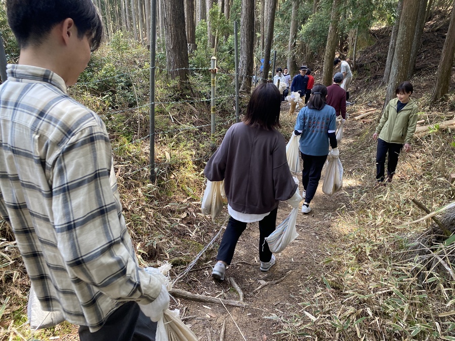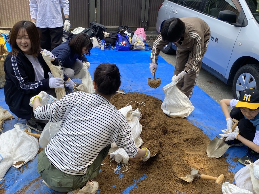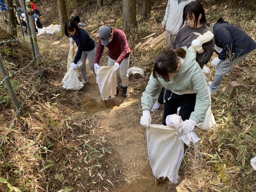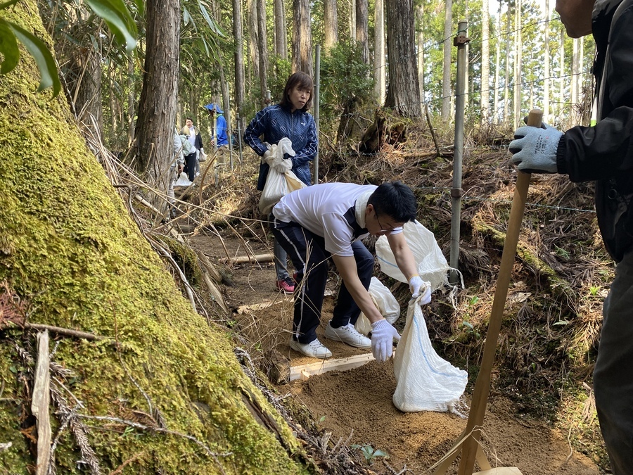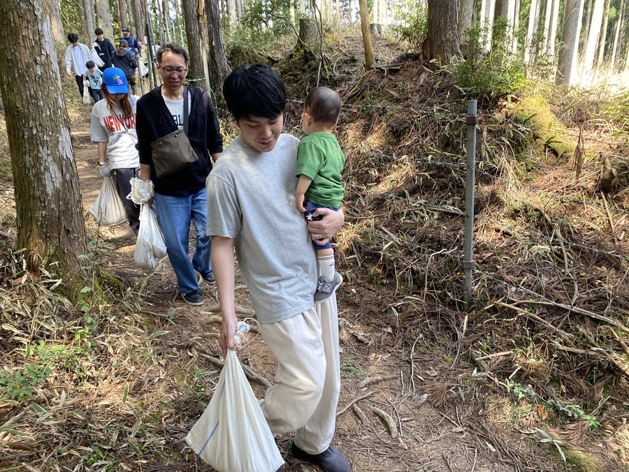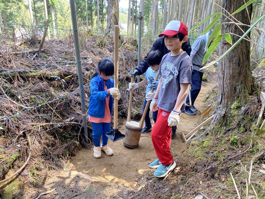今回の道普請は各自現地集合だったので全員が揃い次第、開始しました。土の量は1tで土置き場箇所から作業箇所までは、約100mで幅がかなり狭い所での活動となりました。土を土嚢袋に入れる方、ほうきを使って掃き掃除をする方、土を何度も運ぶ方などに分かれ、狭い作業箇所で効率的に作業を行なっていただきました。小学3年生の男の子は11回運んだと言っていて、もくもくと土を運んでいる姿には逞しさを感じました。子どもたちと一緒に作業をすると場が和み、楽しい雰囲気になるので子供の力はすごいと感じました。