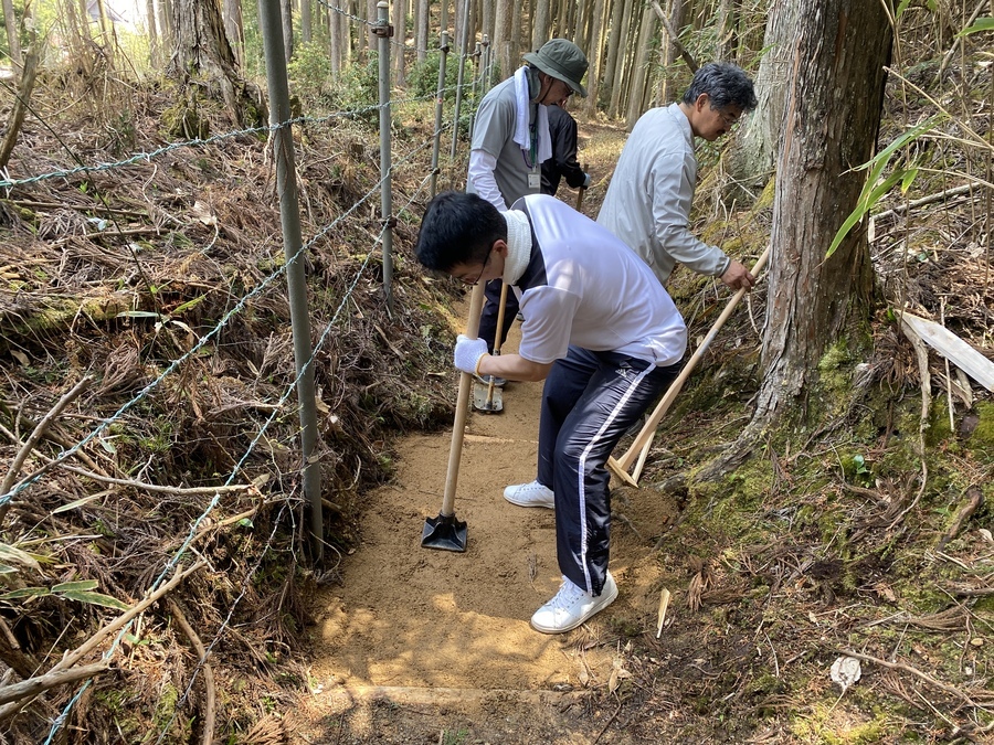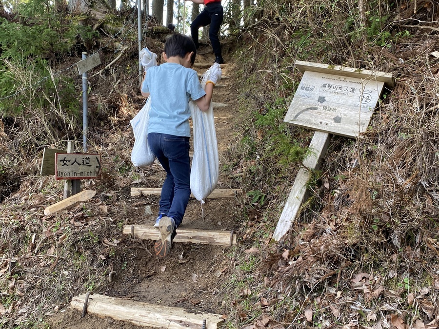 SMBC日興証券和歌山支店様は、今回で3回目の道普請の参加となりました。昨年度は熊野本宮にて2回行いましたが今年度は、高野山の愛宕谷付近で行いました。34名の皆様と一緒に活動することができました。その中には小学生が3名、1歳3ヶ月の赤ちゃんもおられました。