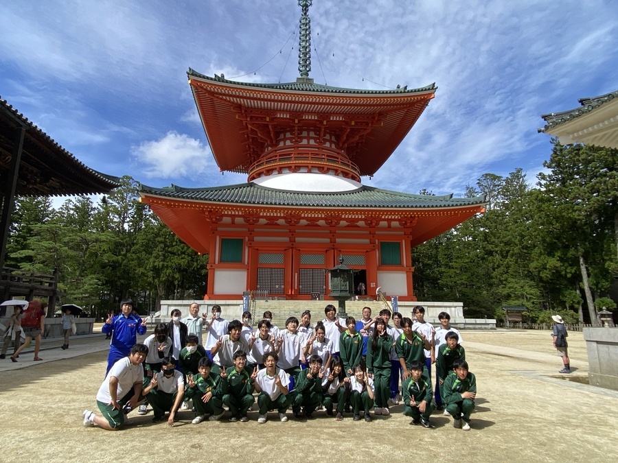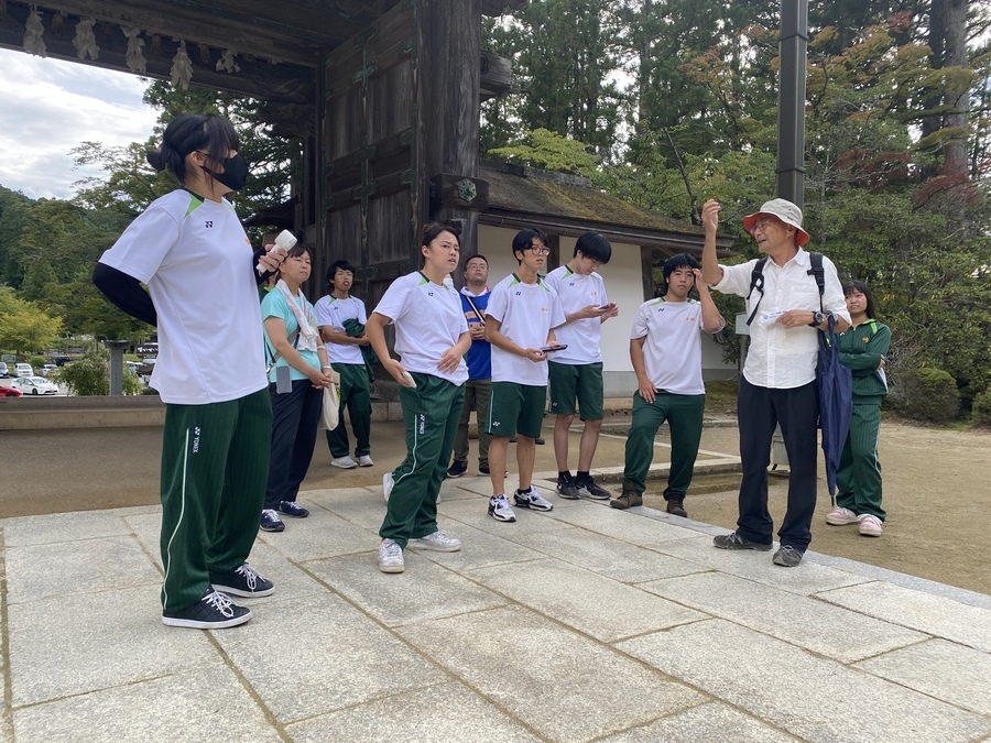 海南高等学校大成校舎の2,3年生31名と引率教員5名の36名の皆様に次世代育成事業にご参加いただきました。今回のコースは高野山で女人道と壇上伽藍、金剛峯寺の現地学習を行いました。