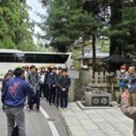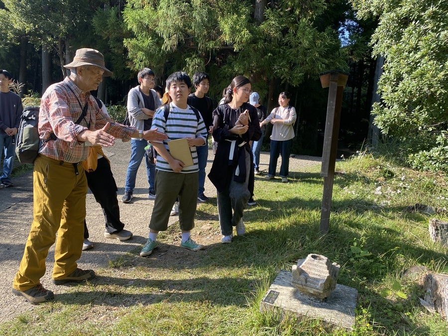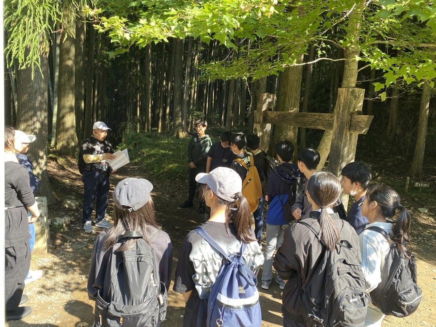 作業終了後は、世界遺産マスターと一緒に三軒茶屋から本宮大社まで現地学習を行いました。初めに三軒茶屋跡、九鬼ヶ口関所について説明していただき、その後「ちょっと見晴らし展望台」で大斎原の眺望を楽しみました。天気も良く見応えも十分で感動されている姿が印象的でした。最後に熊野本宮大社を参拝しました。熊野の神様の話や参詣のマナー等を教えていただきました。