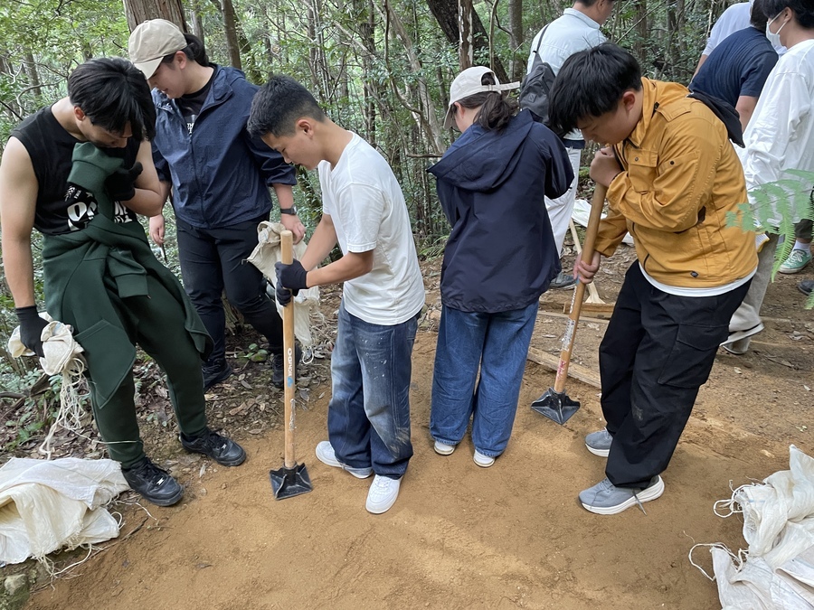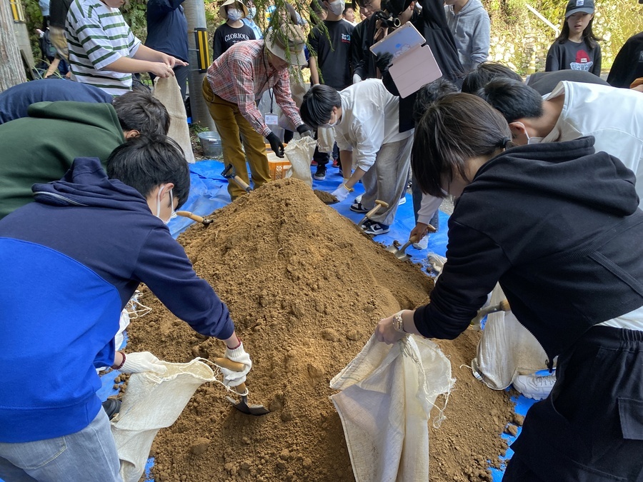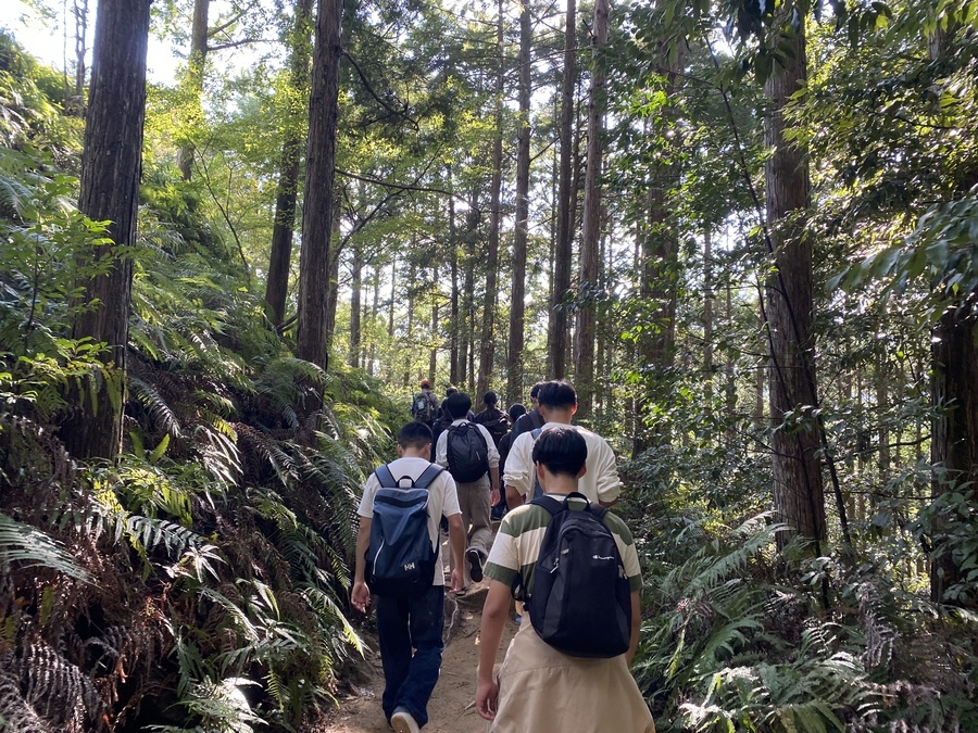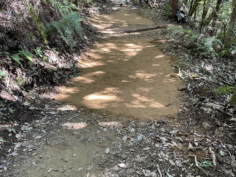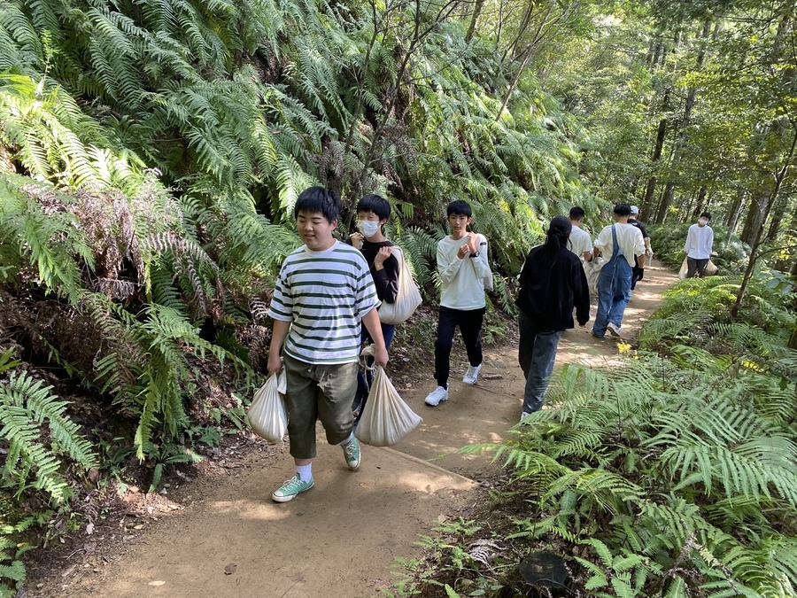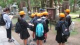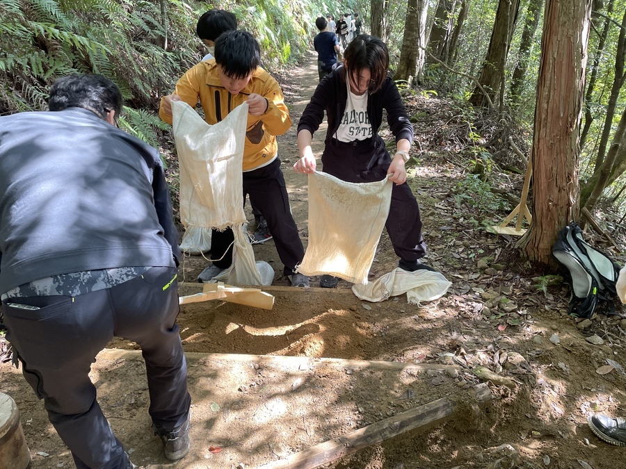 当日は、本宮に来ていただき道普請と三軒茶屋から本宮大社までの現地学習を行いました。初めに道普請ですが三軒茶屋から伏拝王子に向かって約200mのところに1tの土入れを行いました。1番多く運んでいただいた方で5往復していただきました。道普請の作業は始めは大変そうなイメージがありますが作業を始めると皆、勢いよく土を運んでいただき笑顔になる生徒が多く、充実した時間を過ごせたのではないでしょうか。
