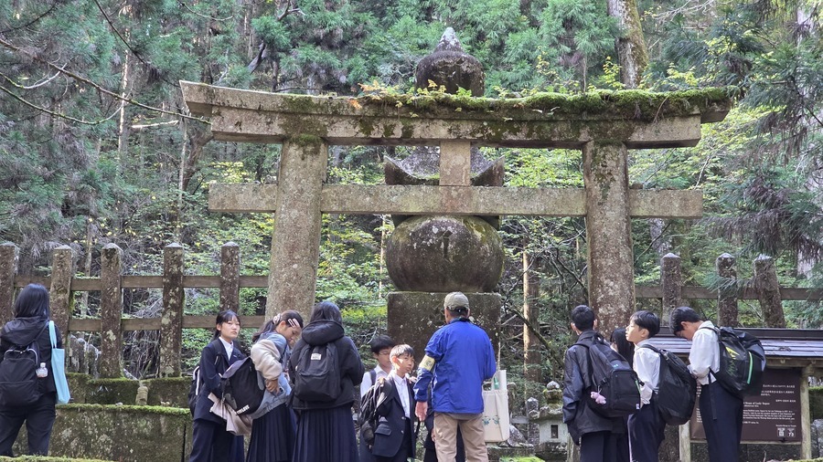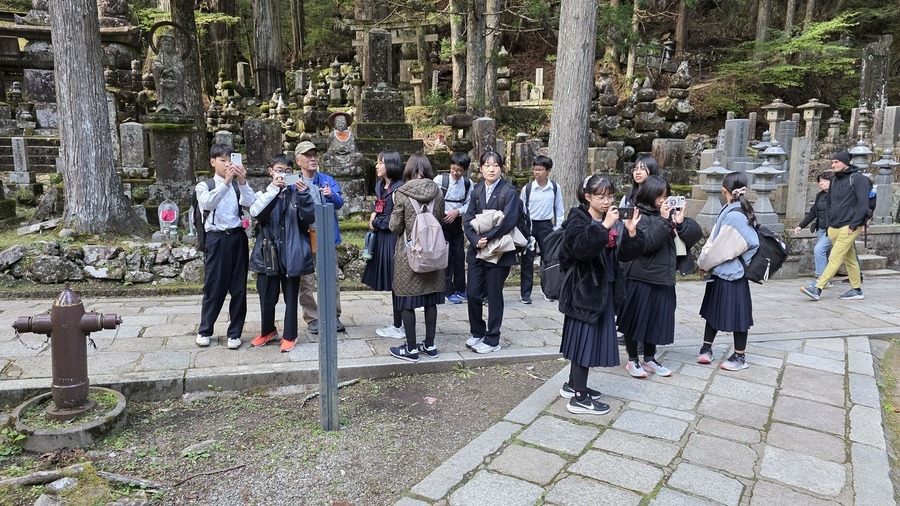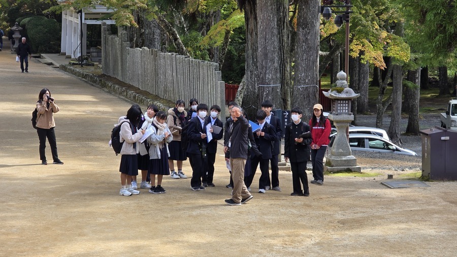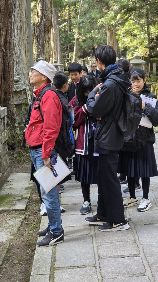 午後からは、一の橋から弘法大師御廟までの学習でした。6班あったのでバスの出発時刻等をずらして対応しました。約2時間の行程の中で戦国大名のお墓や、五輪塔、石造廟などについて学びました。御廟までの道中、外国人観光客の方々に英語で積極的にインタビューをしている生徒もいました。高野山が世界の遺産と感じることができたのではないでしょうか。