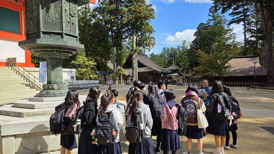 この日も現地は学習日和の天気となりました。今回は人数が多かったため、6班に分け、で午前中の壇上伽藍、金剛峯寺本坊の学習では見学場所を3班ずつ逆コースにして世界遺産マスターに案内していただきました。根本大塔や金堂、金剛峯寺本坊の内拝をし、高野山の中心地の学びがより深まったのではないかと思います。