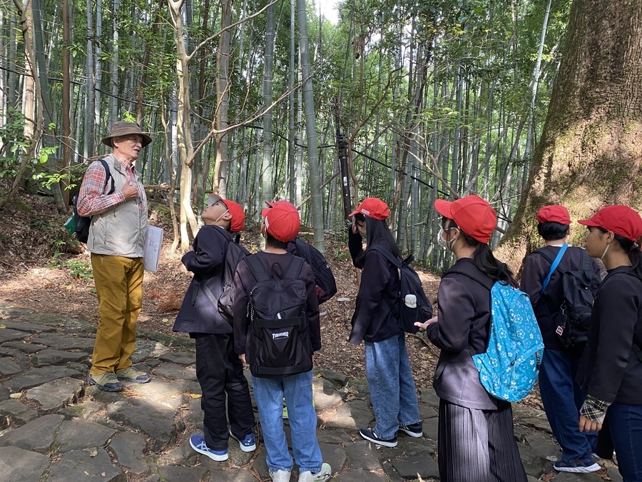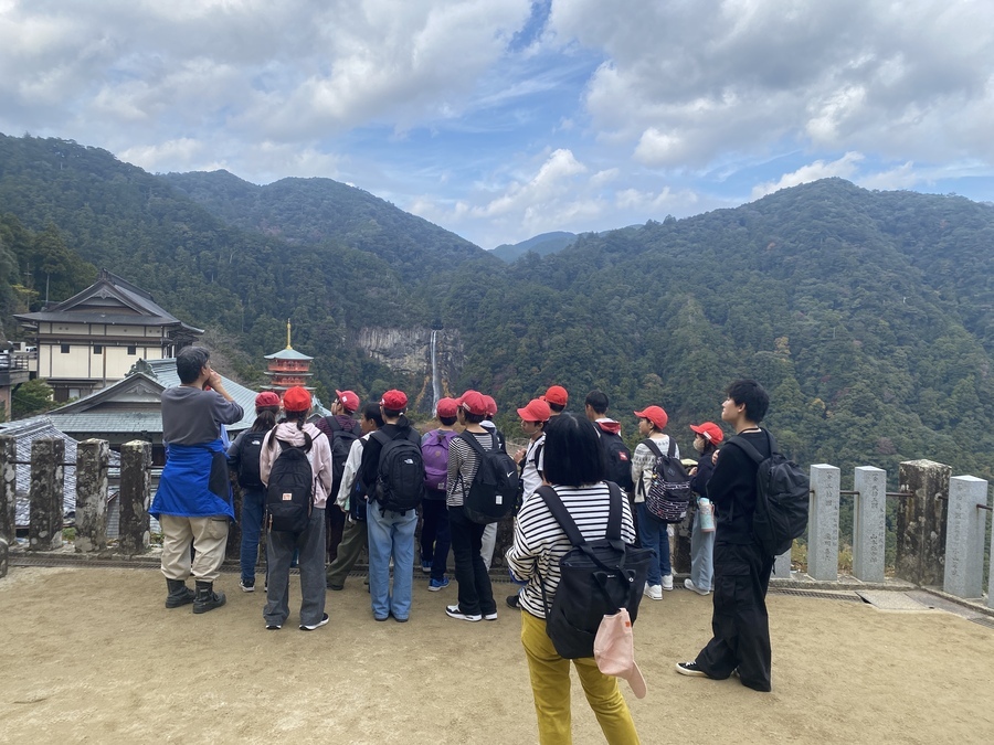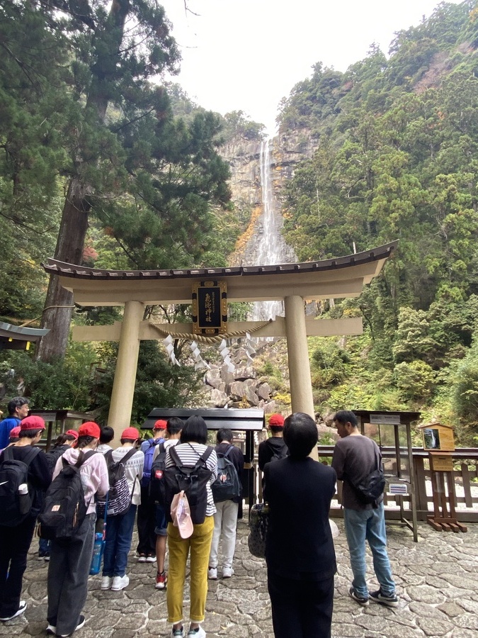 当日は、今季初めての那智勝浦での現地学習でした。バスの移動時間も長く大変だったと思いますが無事到着できたのでよかったです。現地学習は、大門坂駐車場からスタートしました。マスターから樹齢何百年もの杉の木の説明や九十九王子最後の王子社である多富気王子について聞いたりしました。40分程度で大門坂を歩き終え、熊野那智大社に向かいました。長い階段を登り切り、那智の山々を見たときには感動されていました。その後、青岸渡寺にいき日本一の鰐口の迫力を感じながらお参りをしました。三重塔の近くで昼食を食べてから最後に那智の滝をを見学しました。日本一の滝の壮大さに触れ、何か感じることがあったのではないでしょうか。